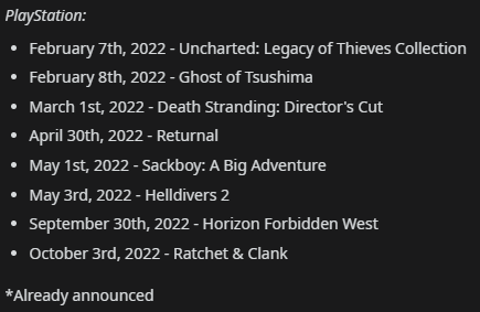 在见证了CDPR在对《赛博朋克2077》事先的过度宣传所带来的惨痛代价之后,如今业内的厂商在能够拿出水准足够高的作品之前,都会对正在开发中的作品保持缄默。可玩家们对此却并不买账,所有人都想知道自己期待的作品,到底开发得怎么样了?未来又有怎样的计划?而英伟达在这个过程中,就扮演着“漏勺”的角色。 不久前在国外Reddit论坛,就有网友对英伟达的GeForce Now数据库进行了数据分析,他发现有几个游戏会进入该服务,并登陆PC平台。并最终推测出了主机平台大作《战神4》,将会登陆PC平台。而在上个月,这个消息也得到了证实。 近期又有新的名单被曝出,所涉及的游戏内容也比玩家事先预想中的更多。这两年已经被很多人奉为国产游戏之光、翘首以盼的《黑神话:悟空》在该名单上的发布日期为2023年5月30日。 另一边已经把老滚5玩出花来的粉丝们,也有望在2024年1月2日见到系列的最新作品《上古卷轴6》。卡普空炒的新冷饭《生化危机4:重制版》,预计将于明年11月份发布。《对马岛之魂》这样的主机大作,同样会在明年2月份上架PC端。 《孤岛危机4》2024年10月25日、《哈利波特:霍格沃茨的遗产》2022年3月8日、《生化危机4:重制版》2022年11月1日、《毁灭全人类3》2022年6月13日、《龙腾世纪4》2022年6月15日、《勇者斗恶龙12》2023年1月1日、《最终幻想16》2023年3月1日、《最终幻想9:重制版》2022年4月1日、《极限竞速8》2022年8月12日、《冰汽时代2》2023年12月6日...... 上述内容只是名单的一部分,不过总览整个条目却迟迟没有出现《GTA6》的身影。结合几天前外媒针对R星“游戏开发陷入混乱”、“《荒野大镖客》复刻版正在制作中”的爆料,《GTA6》何时能上恐怕真的连R星的CEO都弄不明白。 根据R星母公司Taker Two在Q2季度的财报显示,《荒野大镖客2》的销量已突破3900万份,全系列售出6200万份;而《GTA》系列已售出了超过3.55亿份,光是《GTA5》就卖出了1.55亿份。其中的500W份,都是在上个季度达成的交易。 看得出来,仍然还有很多人没有买《GTA5》。 英伟达这次的游戏发布日期泄露名单的真伪还有待考证,不过有了上回《战神4》登陆PC端的前车之鉴,玩家们反正打心底更愿意相信它是真的。很多事情当有了盼头时,往往就会水到渠成。想要辨别真伪,大家只需要待到明年2月看《对马岛之鬼》是否会登陆PC即可。 那么在大家心中更期待哪款游戏的发售呢? |