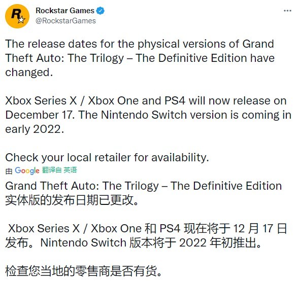 也许是受到游戏质量的影响,Rockstar已经通过官方社交媒体宣布,主机版《GTA:三部曲-终极版》无法按原计划在12月7日推出,PS和Xbox版的实体光盘将延期十天,而Switch的卡带版本则需要等到2022年。 虽然《GTA:三部曲-终极版》仅仅包含三款上市近20年的老游戏,但是对于一直期待新作的玩家来说,对于本作也是寄予厚望,但是游戏发售时遇到了不少低级错误,导致媒体和玩家对于《GTA:三部曲-终极版》普遍难以认可。 不过好在Rockstar第一时间认清形势,迅速做出反应,抽调人手积极开发补丁,该游戏基本保持每周都能推出新的修复补丁。昨天为PC、PS和Xbox平台推出的1.0.3版就修正了贴图中的文字拼写错误、室内下雨等大量BUG。相信等到实体版正式上市时,游戏能够达到正常的质量。 |