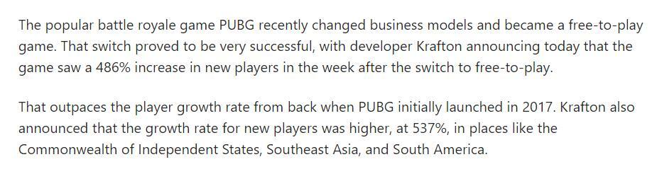 本月12号,已经运营四年多的PUBG正式转为免费游戏。这项措施成了KRAFTON挽救这个大逃杀游戏的最后手段,而事实也证明了将买断制游戏转为免费游戏这个“违背祖宗的决定”确实有独到之处。 免费开放仅仅两天之后,PUBG在Steam上的玩家在线人数就飙升到了60万。尽管这跟巅峰时期百万玩家的数据相去甚远,可如果能够保证这样的势头,PUBG就依然还能维持长期的运营和更新。 时隔半个月,PUBG的近况变得更具参考价值了,玩家数的暴涨究竟是回光返照还是王者归来也将有定论了。 当前PUBG在Steam的玩家在线人数榜单上基本稳定了前五位置,即便是工作日的上午,玩家人数也能保证10万+,这一数据到了夜间还会翻几番。今日的在线玩家峰值,就是50万人(凌晨登录的玩家也被计入在内)。事实证明,PUBG开放免费之后,确实吸引了大批新玩家入坑并留存了下来。 根据外媒报道,PUBG在转为免费游戏以后玩家数量整体增长了486%,东南亚和南美地区的玩家增长537%。这样的增长速率是前所未见的,即便是2017年PUBG刚上线时,也没有达成过半个月内玩家数量翻几倍的壮举。 尽管事先有很多人并不看好KRAFTON靠免费就能重新获得玩家们的认可,但事实证明这波操作真正做到了让PUBG起死回生。为了庆祝PUBG免费后的强势表现,Krafton宣布在1月27日至1月30日期间,玩家只要进入游戏游玩至少一小时,就能解锁免费的特殊游戏奖励。 目前来看一切都在向着好的方向发展,PUBG的排位玩家明显感受到了恼人的外挂问题获得了减轻。不过相对的,官方报道的外挂封禁统计,也从游戏免费前的2万+,增长到了免费后的5.9万。PUBG游戏玩家的数量增长了4倍的同时,开挂的人也增长了3倍。 当然,游戏环境到底怎样每个玩家都有自己的评价和观感,不排除有“打不过就是挂”的情况。普通玩家和排位玩家所处的对局环境,也并不对等。实际情形如何,还需要玩家自行体验。而KRAFTON要想保住当前的盛况,则需要在未来付出更多的努力。 那么大家觉得PUBG的第二春能一直延续下去吗? |