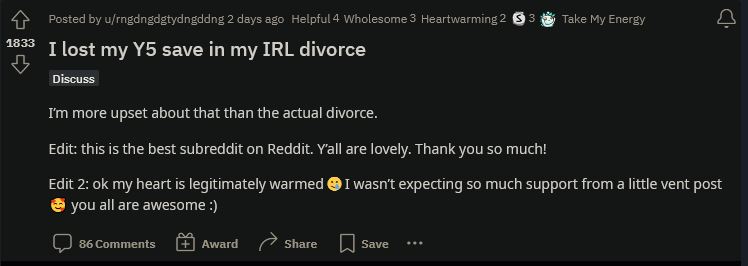《星露谷物语》的一位粉丝透露,作为现实离婚的一部分,她失去了多年的游戏存档和游戏中最昂贵的物品。在 Reddit 上他透露道,她失去的游戏存档耗费了五年时间,这件事比离婚本身让她更加难受。 《星露谷物语》在约六年前发布,但它依然有着巨大的忠实玩家群体。之后游戏的多人模式更新让它更加容易让人上瘾。许多人沉迷在虚拟的人生中,并且也借由联机模式将现实世界的关系带入星露谷中。目前,游戏截至 2021 年 9 月已售出超过 1500 万份。 因此,也不难理解这位玩家对星露谷的生活更加依依不舍。离婚人在她丈夫的 Xbox 上玩游戏,在他们离婚时主机也被丈夫带走,抹去了多年的辛苦耕作。她表示自己在游戏中有 30 万金币,并且还有“回程魔杖”。这是游戏中最昂贵的物品之一,价值 200 万金币,允许玩家在农舍外直接传送回家。 其他网友对她的损失感到震惊和理解,并希望尽其所能帮助发帖者找回存档。一些可能的解决方案包括尝试确认存档是否还在 Xbox 云中,这样还可以在另一个 Xbox 上继续访问该存档。有些人甚至提议为发帖者购买一部 Xbox 主机,让她可以继续自己的游戏人生。不过目前,《星露谷物语》也已经加入 XGP。但是根据发帖者提到离婚的具体情况,目前唯一的方案只有从头开始。不过,她提到自己也有一部 Switch Lite 主机,希望在新的存档中她能再次获得同样的快乐。 |