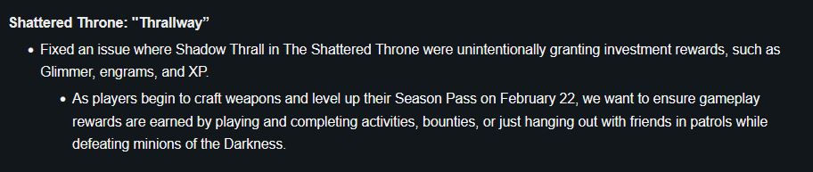 Bungie 最新的每周更新日志重点为即将上线的“智谋”游戏模式重做,以及下周即将上线的《邪姬魅影》DLC 补丁说明预览。但在这些大型改动下还隐藏了突袭“破碎王座”即将发生的改动。该改动将打击游戏中最著名的“练功房”。 更新日志中说道:“修复了破碎王座中暗影奴仆非设计本意地给予资源奖励的问题,例如微光、记忆水晶以及经验值。随着玩家在 2 月 22 日开始制作武器并升级他们的赛季通行证,我们希望确保玩家只能通过游玩、完成活动、悬赏或和朋友一起巡逻时击败暗影爪牙来获得游戏奖励。” 该声明并未针对任何人,但明确指出游戏中长期存在的一个问题。“练功房”区域的名称来源于其无限产出弱小的暗影奴仆敌人,让玩家可以迅速击杀。同时还有一些玩家通过使用宏或其他方式来在 AFK 的时候击杀这些敌人,迅速地获得赛季等级或神器经验值。游戏中可以看到一些赛季等级为四位数的玩家往往都是通过这种方式刷出来的。 该补丁还将对 BOSS 踩地板攻击的击退效果进行调整,这“应该会减少因撞到物体而导致死亡”的概率。 《命运2:邪姬魅影》DLC 将于 2 月 23 日发售。 |