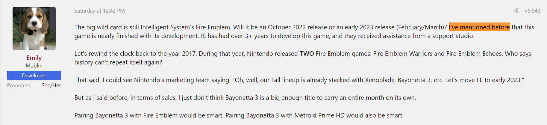 根据业内知名消息人士Emily Rodgers爆料,今年可能会发售第二个《火焰纹章》游戏。 Emily Rodgers在过去曾多次准确爆料了任天堂游戏,她最近在Famiboards上和玩家互动时表示,第二个《火焰纹章》游戏正在由Intelligent Systems开发中,可能在今年10月发售。 她说:“我之前就说过,这个游戏的开发快完成了,Intelligent Systems已经开发了超过3年时间,他们还从辅助工作室那里获得了帮助。” 虽然Rodgers推测新的《火焰纹章》游戏有可能会跳票到2023年,但她同时提到在2017年发售了两个《火焰纹章》游戏:《火焰纹章无双》和《火焰纹章回响(Fire Emblem Echoes)》,暗示2022年可能也会这样。除了这个未公布的《火焰纹章》游戏外,《火焰纹章无双:风花雪月》将于2022年6月24日发售,登陆Switch。 在2月10日的任天堂直面会上,《火焰纹章无双:风花雪月》正式公布,设定在2019年游戏《风花雪月》同一个宇宙中,但会有一个新的故事,由光荣开发。 |
