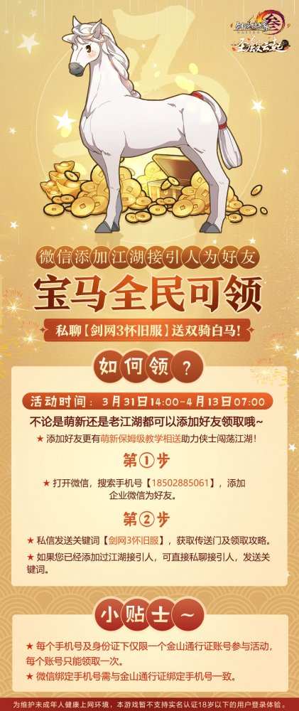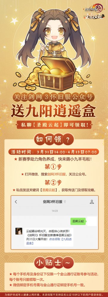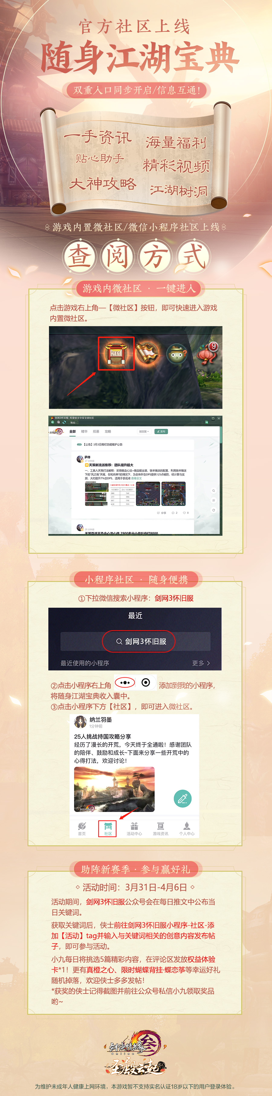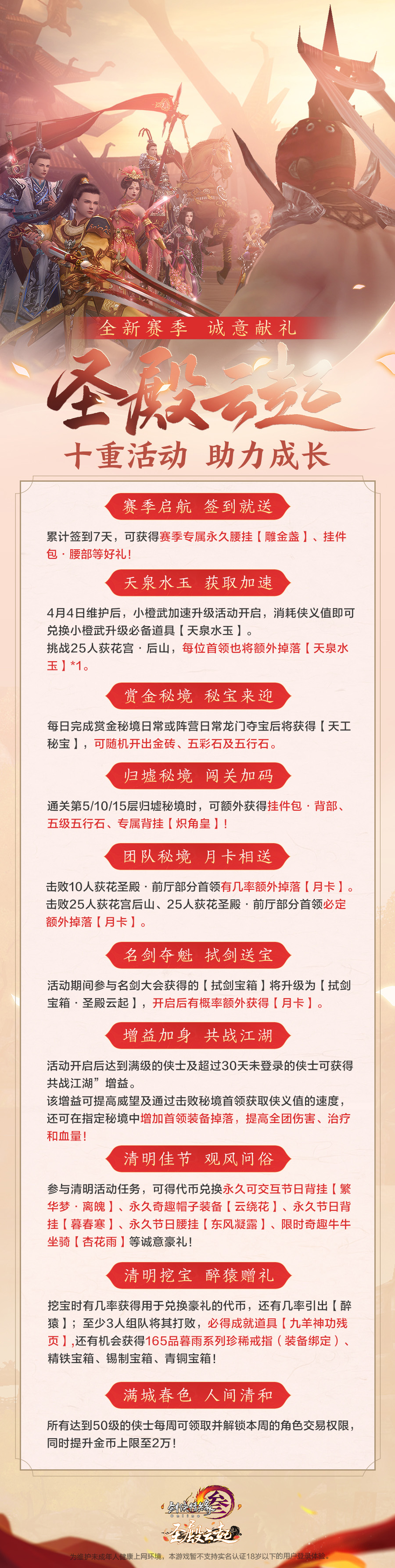 云起霜谷明光灭,赤胆侠心诛妖邪!《剑网3》怀旧服新赛季“圣殿云起”今日重磅开启!全新赛季,诚意献礼!花样玩法肆情体验,更有丰厚福利海量放送,助战侠士新赛季火力全开! 【玩法焕新 奇趣横生】 秘境战圣殿,竞技显身手。10人/25人团队秘境【荻花圣殿·前厅】将于3月31日20:00开放,待你赛季初探!全新挑战玩法【归墟秘境】上线,单枪匹马即可体验各类战斗机制!赏金秘境全面更新,五大新秘境带来焕新体验!全新对抗日常【龙门夺宝】、全新战场【三国古战场】、阵营攻防拍卖系统三端革新,注入崭新对战活力!新赛季内容满满,邀君共赏: 点击查看新赛季花样玩法: 【十重活动 助力成长】 蓄势上九霄,全民送福利。十重活动福利满满,助力侠士开启赛季新征程!正值清明时节,节日活动亦踏青而来,与侠士共度传统佳节,同谱大唐华丽新篇章。 【社区活动 全民狂欢】 全民共狂欢,同贺新赛季。3月31日14:00-4月13日7:00,每位侠士皆可通过关注“剑网3怀旧服”公众号、添加“江湖接引人”企业微信,赛季启程好礼——直升丸子【九阳修缘丹】、限时双人同骑白马【残雪】无门槛相赠! 【信息互通 一手掌握】 宝典随身带,海量信息通。今日起《剑网3》怀旧服官方微社区双重入口同步开启,江湖路你我共行更添精彩!3月31日-4月6日,跟随剑网3怀旧服公众号关键词至社区发布创意内容,还有【权益体验卡】、【限时蝴蝶背挂·蝶恋筝】随机掉落! 《剑网3》怀旧服新赛季“圣殿云起”重磅来袭,玩法福利乐无穷!多重福利助力侠士开启新征程,更有惊喜好礼放送不停!欢迎各位侠士重游故地,回到梦开始的地方,追寻昔日江湖情! |