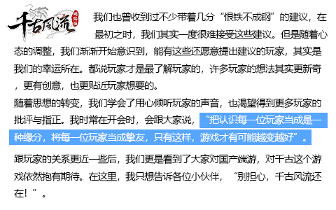 近日,《千古风流》的运营在官方论坛宣布游戏在4月16日进行终测,还对玩家一通深情告白,把一群大老爷们鸡皮疙瘩都看起来了,让玩家们又感动又感慨。 这个团队到底经历了什么?这款游戏到底发生了怎样的变化?要知道之前他们可是宣称要做“自己喜欢玩的端游”,难道现在是要“抛弃”理想了吗?还是浪子回头要做一款“玩家喜欢的游戏”? 其实很多人一开始就理解错了“自己喜欢玩的端游”,千古团队并不是要以自我为中心的去“定制”游戏,而是抛弃所谓的市场规律,不理会对端游的刻板印象,按照喜欢的样子去塑造游戏。 一个团队怀抱着这样的心态,怎么会做不出好游戏?但一开始玩家的反应却和他们预想中不同。或许是一些创新的元素太过于理想化,也或许是他们在做端游这条道路上的经验不足,很多稀奇古怪玩法没有让玩家喜爱反而被疯狂吐槽。 玩家的各种反馈让《千古风流》的团队意识到,只专注于理想中的端游是不够的,只有善于听玩家的声音才能做出真正的好游戏。他们明白了,每一个想为国产端游出一份力的玩家,都是“自己人”,于是他们在做“自己喜欢的端游”这条道路上更加坚定! 他们在后来的测试中都在认真对待这些“不一样”的声音。就拿玩家一直反映的“缺钱”问题来说,官方在几次的更新中都调整了刷怪掉落,不仅铜钱掉落翻倍,掉落的战利品也越来越多,甚至还能掉落实物家电。在终测版本中打怪还能掉落卡牌,听说他们很有创意地将游戏中的野怪都封印进卡牌, 甚至能代替玩家出战。还有被玩家吐槽最多的概率问题,官方也是彻底进行了优化调整,例如背包扩容的概率调整到了100%,披风升阶和洗炼的概率也全面改版,很多玩家开玩笑说,以前的披风可是摸一下就爆,哪像现在追求的都是高阶全S披风。 《千古风流》能越来越好,越来越多的评价从吐槽变成了肯定,这是玩家和千古团队共同努力的结果。可以说这款游戏是千古团队和玩家一路同行,共同铸就的。官方表达感谢的方式也非常有创意,他们“简单粗暴”地决定将所有测试充值回馈给玩家。 《千古风流》现在究竟成长成了什么样子?4月16日,终测版本上线,让我们拭目以待吧! |
