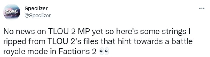在原版《最后的生还者》中,名为“Factions”的多人游戏模式广受好评,粉丝们期待在《最后的生还者2》中看到类似的模式,但关于《最后的生还者2》多人游戏的消息,开发商顽皮狗并没有透露很多。 现在,根据Mod作者Speclizer的发现,《最后的生还者2》的多人游戏中可能会包含大逃杀模式。Speclizer从《最后的生还者2》中提取了部分文件内容1,他发现这些文件中的字符串引用了通常与大逃杀游戏相关的词汇,甚至直接包括了“大逃杀(battle royale)”字样。 这些发现并不意味着大逃杀模式一定会加入《最后的生还者2》的多人游戏,在顽皮狗决定正式展示之前,这只能是玩家的猜测。 |