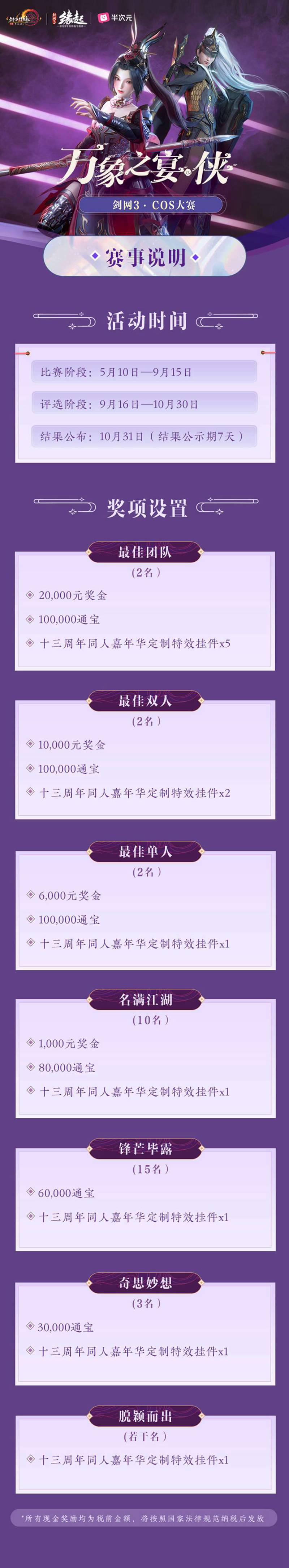 万象江湖,侠行盛宴,《剑网3》十三周年同人嘉年华今日盛大开幕,邀你共赴同人创作!八大赛事展示全新魅力,更有小红书全品类特别赛区激情加盟,以手中纸笔描绘心中多彩江湖!各项赛事安排时间现已出炉,侠士们期待已久的COS、绘画大赛今日首发盛启!快来跟随资讯一起看看吧! 主KV海报 COS大赛 绘画大赛 游戏摄影大赛 视频大赛 周边设计大赛 原创音乐大赛 外装设计大赛 壁纸大赛 小红书全品类特别赛区 八大赛事+小红书全品类特别赛区,等你来一展风采!百万奖池、海量通宝、十三周年同人嘉年华定制特效背部挂件等众多好礼等你来拿,精彩变化一睹为快: 今年赛事截稿时间延长至9月15日,侠士们有更多时间筹备创作啦~ 小红书全品类特别赛区全新启动,只需要带#剑网3 #剑网3同人嘉年华 分享任何赛事参赛作品至小红书,就有机会获得同人嘉年华定制挂件(专属色)! 大部分赛事均新增【奇思妙想】创意奖项,鼓励侠士从题材、立意、技巧等多方面进行创新尝试,一起打造包容、创新的万象之宴! 【江湖儿女绎江湖《剑网3》同人COS大赛今日开赛】 江湖万象,百人千面!《剑网3》携手半次元cosplay频道,为各位有爱Coser提供一个展示自我的盛装舞台!《剑网3》十三周年同人嘉年华COS大赛今日火热开赛,投稿通道正式开启!获奖Coser还有机会参与官方COS宣传旅拍、担任官方周边模特等深度合作,获得额外丰厚报酬,享有线上线下活动优先邀请资格! 同人COS大赛海报 【笔尖浓墨绘春秋 《剑网3》同人绘画大赛今日开赛】 泼墨一卷河山,挥毫描绘江湖,《剑网3》十三周年同人嘉年华绘画大赛今日盛启,携手半次元绘画频道,诚邀各路画师共赴江湖盛宴! 参与活动获取丰厚奖励,优秀作者还有机会参与官方宣传等深度合作,一起共创豪情江湖! 值得一提的是,本届同人绘画大赛延续设立【小头像】、【表情包】特别奖项,为侠士提供更多选择和更加广阔的舞台! 同人绘画大赛海报 万象江湖,期待侠士们的全新创作,一起共赴盛宴!更多同人赛事即将陆续开启,欢迎各路侠士踊跃投稿,尽展江湖儿女情!让我们用心中最真挚的热爱,共绘江湖无限盛景! |