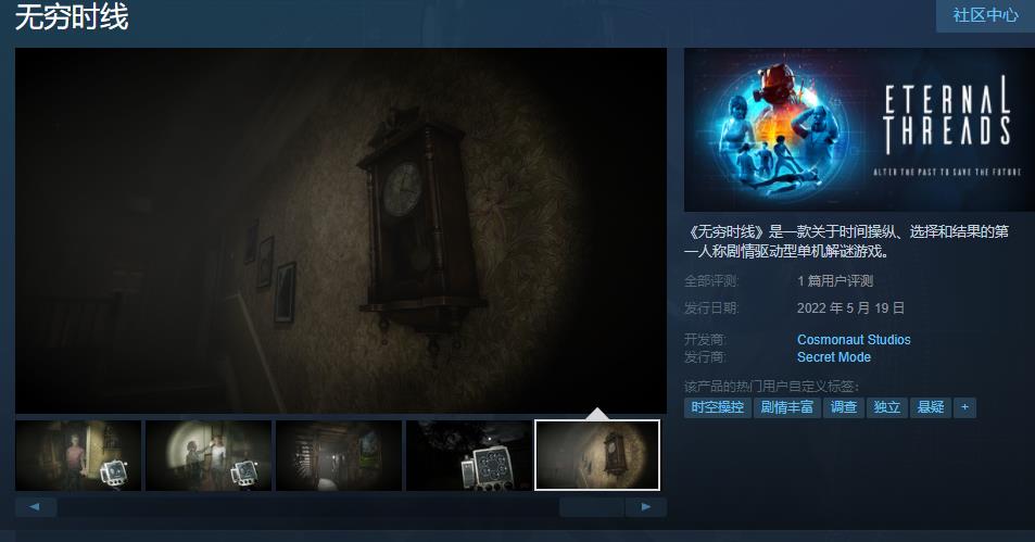 解谜游戏《无穷时线》现已正式发售,游戏支持简体中文,Steam国区原价108元,发售特惠97.2元,感兴趣的玩家可以关注一波。 游戏介绍: 《无穷时线》是一款关于时间操纵、选择和结果的第一人称剧情驱动型单机解谜游戏。 玩家将扮演一名特工,受命修复时间流中的受损点,被派往2015年5月英格兰北部地区的一处住宅火灾现场,以拯救不幸殒命的6个人。你要做的并非简单地阻止火灾发生,而是要操纵6位住客这一周以来所做的选择,让他们得以在这场大火中幸免于难。 游戏特点: 按自己的想法选择如何推动游戏剧情。 完整旁白内容覆盖全部六位主角,贯穿多条时间线的多个决定,玩家可以按自己所选的方式随意体验。 你可以一次只专注于一个特定角色的故事线,跟随该角色在整条时间线中的选择,然后再回过头,重新跟进另一个角色。 你可以像法医一样还原整个故事,观察故事的最终结果,然后沿着时间线逆向思维——大体来说就是观察效果,然后确定原因。 或者你也可以单纯地按时间顺序观看一切,在观察中体会整条时间线慢慢展开,然后改变角色在这一周的进展中所做的决定。 所有事情都可以观看和更改任意次数 记不住某一事件中到底发生了什么?更改决定后不确定对结果满不满意?没关系。只要沿着时间线倒回去,观看和更改任意内容即可,只要你愿意,多少次都可以。 改变过去,影响未来 将临时基地设置在这座房子里,时间就在火灾发生数小时之后的时间点,这样可以形成对事件的独特视角。当你回顾时间线时,过去的事件会像幽影一般在你面前播放,而烟雾和大火损坏的房屋则一直提醒着你即将要发生的事情。而且,当你操纵过去时,你周围的环境可以重置,以匹配所发生的改变。一些新的物品将会出现,其他东西则会在房子里变换位置,而且室内的物品也基本上会伴随着你改变过去而发生相应变化。 游戏截图: |