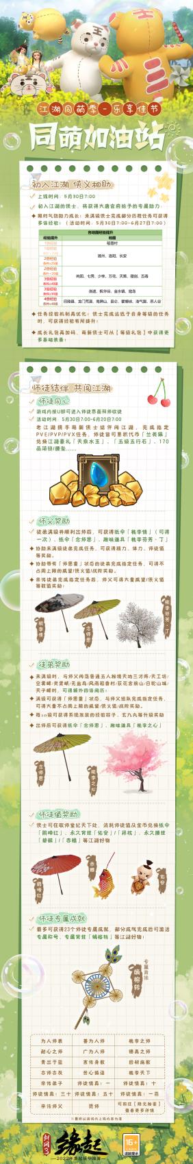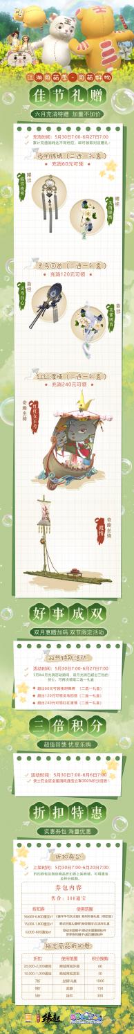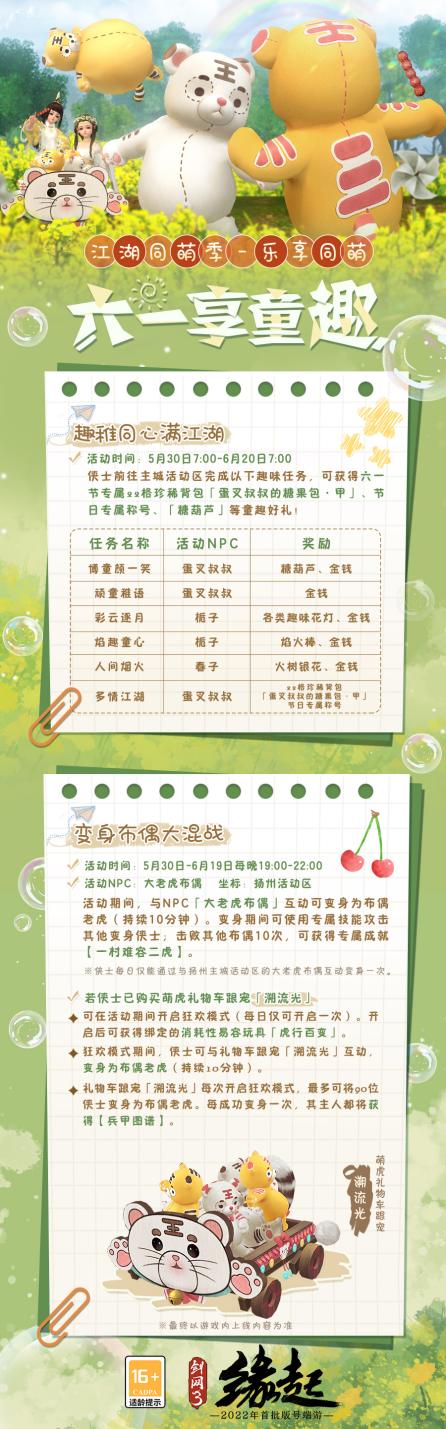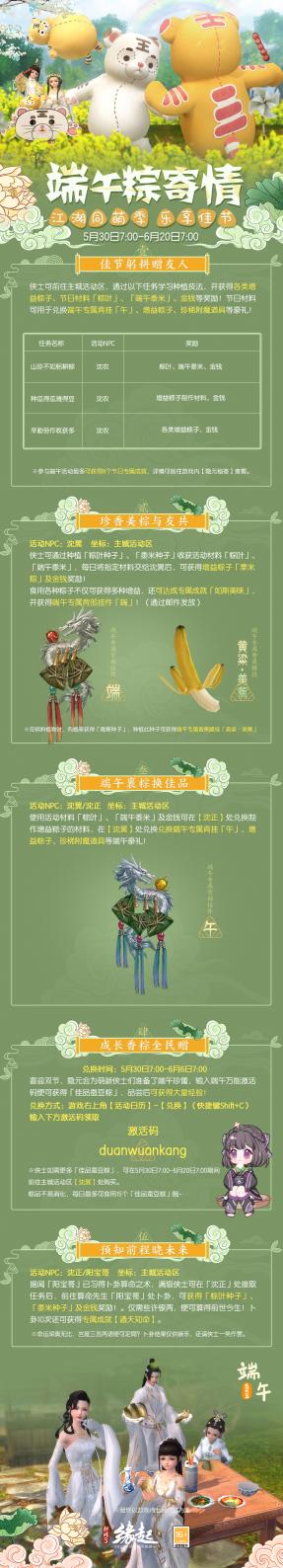 乐享端午,萌动江湖!仲夏好韶光,传统民俗大节端午佳节与童趣六一儿童节双节同至,万众期待之际,大唐也迎来了多样萌趣活动!栽作物、包粽子,躲猫猫、装布偶,还有挂件、专属成就相赠!成长助力活动火热来袭,萌新升级、师徒结伴,多重礼遇邀君同行大美江湖! 【飘香时光 端午粽寄情】 躬耕闻粽香,卜算藏玄机。经典活动节日韵味愈浓,参与活动兑换专属节日挂件【端】、【午】、【黄粱·美蕉】,更有年度成就相送!请君一览: 【萌动江湖 六一享童趣】 犹记童稚乐,归来复梦长。一同欢聚大唐江湖,童心闹佳节!还可获得六一专属22格珍稀背包、称号等好礼哦! 【师徒同心 时清正前行】 浩浩凌云志,同心闯江湖。江湖同萌季更有萌新成长礼包、师徒共战大礼献上,助力新老玩家同心结伴,扬鞭策马,快意江湖! 【联动好物 童趣新萌品】 《剑网3缘起》×《喜羊羊与灰太狼》跨界联动,为大唐带来充满崭新童趣的青青草原时尚风潮!穿上童年伙伴“cos”外装,纵享奇趣特效,携侠士同忆温热童梦! 5月13日7:00-6月27日7:00,儿童节新品来袭,萌动“布脑斧”礼物车、趣味【芽芽】系列帽子、萌趣尾巴腰部挂件等新品火热开售,变身萌虎,欢闹六一! 【特惠特赠 加量不加价】 新月度充消来袭!5月30日7:00-6月6日7:00活动期间,侠士在全区全服消耗通宝享三倍积分回馈! 5月30日7:00至6月27日7:00,累计充值消耗达到不同档位,即可领取对应赠礼; 另有双节限定充消活动,惠赠加码!5月及6月充消活动期间,双月充消已超出三档的侠士,可再次领取二选一礼盒! 5月30日7:00至6月20日7:00,商城折扣券专区【儿童节折扣券包】、指定商品专项折扣券限时上架,分别可用500通宝、不等数额积分兑换: 《剑网3缘起》新版本“五毒现世”版本震撼公测!双节同庆,江湖同萌!多重福利助力侠士开启新征程,更有惊喜好礼放送不停!欢迎各位侠士重游故地,回到梦开始的地方,追寻昔日江湖情! 客户端下载地址:https://jx3yq.xoyo.com/index/#/download |