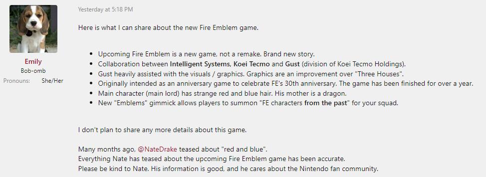 近日,知名舅妈Emily Rogers爆料了一些关于《火焰纹章》下一部作品的信息,Emily Rogers过去曾多次准确爆料任天堂的相关内容,其消息具有一定可信度。根据她的说法,下一部《火焰纹章》将拥有全新的故事,并非重制版。 以下是爆料的重点内容: ·即将到来的《火焰纹章》是一款新游戏,不是重制版,将拥有全新的故事。 ·由Intelligent Systems社、光荣特库摩、Gust(光荣特库摩旗下工作室)合作开发 ·Gust协助了游戏的视觉部分,对比《风花雪月》的画面有所改进 ·游戏已经完成一年多了,最初打算作为周年纪念游戏来庆祝《火焰纹章》系列30周年 ·主角的头发为红蓝配色,母亲是龙人族 ·新的“纹章”系统允许玩家召唤“过往《火焰纹章》的角色”。 |