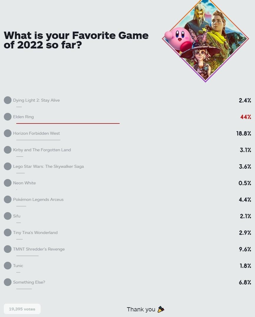 不知不觉,2022年已经来到了第七个月。虽然许多玩家期待的作品,并没能如期上线,但还是有不少精品游戏,给人留下了深刻的印象。关于哪款游戏更优秀的讨论,在玩家群体间向来不缺热度。而想要得到答案,最直白的表现方式莫过于投票。 日前权威游戏媒体IGN就在网上发起了投票,面向全体玩家。许多游戏都登上了这份榜单,但相互之间的差距还是相当明显的。截止到目前,排名前十的游戏分别是—— 1.《艾尔登法环》44%、2.《地平线2:西部禁域》18.8%、3.《忍者神龟:施莱德的复仇》9.6%、4.其他游戏(玩家自填)6.8%、5.《宝可梦传说:阿尔宙斯》4.4%、6.《乐高星球大战:天行者传奇》3.6%、7.《星之卡比:探索发现》3.1%、8.《小缇娜的奇幻之地》2.9%、9.《消逝的光芒2:人与仁之战》2.4%、10.《SIFU师父》2.1% 宫崎英高的开放世界魂like游戏《艾尔登法环》,得到了海量玩家的认可与支持,并以接近半数的优势位列第一。半年内卖出超过1200万份游戏销量拔群,外加超高的口碑,已经让不少玩家打心底认可它是2022年的年度最佳游戏 《地平线2:西部禁域》在发售之初,曾因为女主的外观建模问题而颇受争议。可是要评价一款游戏的品质,应该是全方位的。不管是在游戏性、技术力还是剧情玩法上,这款游戏在2022年都是当之无愧的第一梯队。 排在第三的《忍者神龟:施莱德的复仇》,是最近发布的游戏。在诸多同行都在对标技术能力、花式炫技的当下,Tribute Games选择了风险最小,却又最容易引起玩家共鸣的方式制作游戏——追忆过去。 而从结果来看,《忍者神龟:施莱德的复仇》这款不管看起来还是玩起来都非常“复古”,玩法上中规中矩的游戏,因为情怀,非常容易就得到了认可。似乎通过玩这款游戏,玩家就能找回从前流逝的时间。 从第四名开始,后面的作品之间相互的差距就不大了,基本都在2个百分点之内,比的就是谁的玩家数更高。 若要问这样的投票,对年度游戏评选是否有影响?答案是没有。可是按照以往的惯例,TGA年度最佳游戏,基本都会从这份榜单中排名靠前的作品中产生。毕竟能让绝大部分人都觉得好的游戏,不正代表着它的品质出众? ——游戏大年永远是明年。 对于这样的论调,许多玩家都深以为然。因为不管原计划有多严丝合缝,最终都可能赶不上变化。因为一些大作的延期,整个2022上半年《艾尔登法环》完全看不到竞争对手。虽然这时候说还有些为时尚早,但《艾尔登法环》很可能会统治全年,并一举摘得TGA年度最佳桂冠。 那么IGN的这份榜单,符合大家预期吗? |
