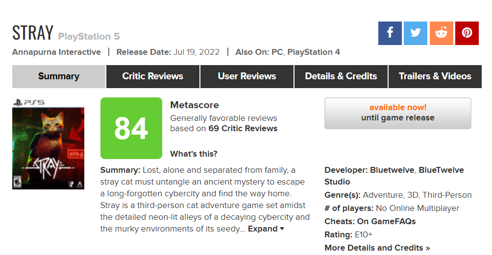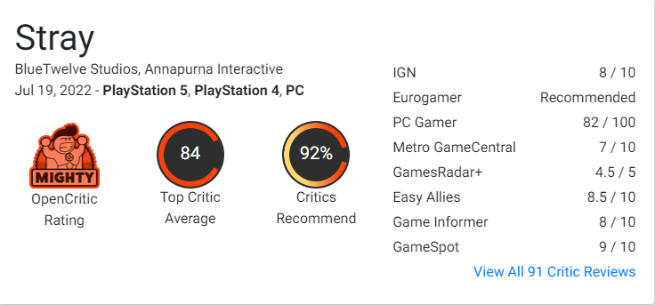 猫咪冒险游戏新作《迷失》媒体评分现已解禁,Metacritic给出了83分,59家好评,10家中评。OpenCritic则是84分,GameSpot满分10分给了9分,IGN评分8分。《迷失》将于今日(7月19日)发售率先登陆PS4和PS5平台,20日凌晨0点在Steam平台解锁,游戏首发加入PSN会员二、三档游戏库。