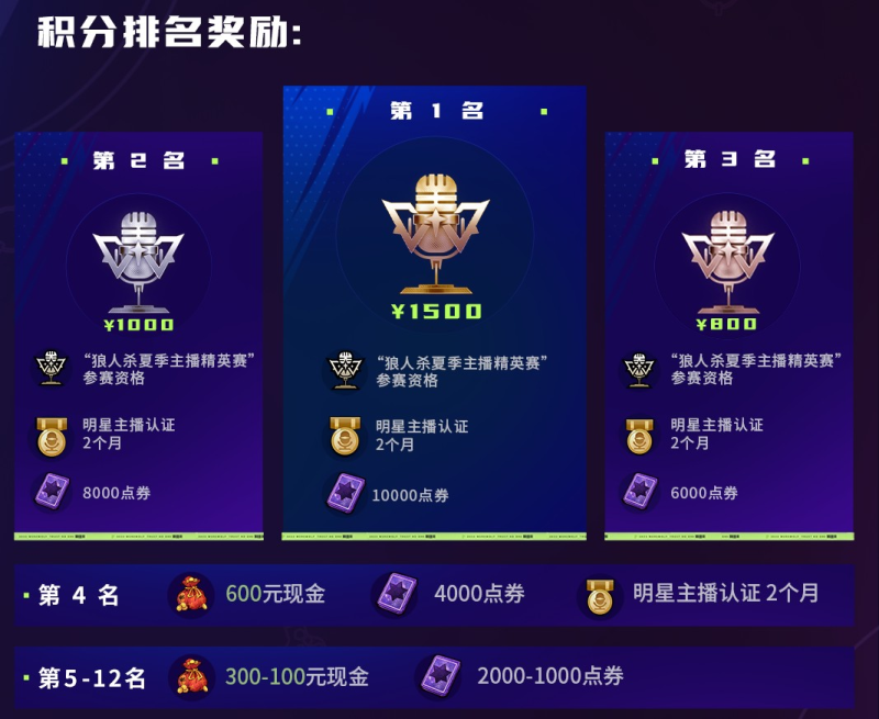 由《狼人杀官方》举办的大型主播赛事——“狼人杀夏季主播争霸赛”火热来袭!哔哩哔哩直播平台现已正式开启报名,参与赛事即可获得点券、时装等奖励,还有海量资源扶持、超多现金福利等你来领! 在狼人杀哔哩哔哩平台的夏季主播争霸赛中获得前三名的主播可直接晋级“狼人杀夏季主播精英赛”,与全平台的最强人气主播们,共同争夺2022狼人杀英雄联赛总决赛的门票! 【丰厚奖励,千元现金等你来拿】 此次成功报名狼人杀夏季主播争霸赛(哔哩哔哩平台)并且完整参与比赛的主播选手,即可获得点券及游戏道具奖励。成功夺得前三名的主播选手不仅能拿下千元现金奖励,还将获得狼人杀夏季主播精英赛的参赛资格。 取得4—12名成绩的主播选手也能获得现金奖励以及游戏点券奖励。同时,每局比赛中表现最佳的选手可获得游戏内宝箱奖励。比赛周期内,在哔哩哔哩直播平台《狼人杀官方》专区直播时间最长、人气最高的主播选手,每人将分别获得额外现金奖励。 【报名开启,方式规则抢先看】 本次狼人杀夏季主播争霸赛哔哩哔哩直播平台报名时间为2022年7月22日至2022年7月28日,哔哩哔哩主播需按照报名问卷要求填写相应信息方可报名。主播完成报名后,《狼人杀官方》与平台将结合综合数据进行筛选,被选中的主播将与官方直邀主播一起,组成18人明星主播候选团,开展明星主播争霸赛。 为确保比赛的公平性,官方还将根据主播所在门派情况进行筛选,在其他条件相似的情况下,将优先选择来自不同门派的主播选手。 狼人杀夏季主播争霸赛哔哩哔哩直播平台报名即将开启,首周赛程将于8月5日正式开启,期待主播们大显身手,带来精彩对局! 关于《狼人杀官方》—— 《狼人杀官方》一直以来致力于游戏玩法的打造,力求给玩家带来最满意最优质的玩法体验以及游戏环境,积极开拓全新玩法,女巫、守卫、摄梦人、魔术师、猎魔人等板子应有尽有。 全新模式“跑跑狼人杀”重磅来袭,三分钟爆笑推理,随时随地来一局,欢声笑语乐不停!实景操作古风Q萌小人嗨翻浪漫碎叶城,狼人钻地道、搞破坏,好人喂黑猪、炼仙丹,还有更多逗趣任务等你来解锁!8人10人12人超多娱乐进阶模式,明星主播都在玩。快来狼人杀官方,和全网年轻人热闹组局! |