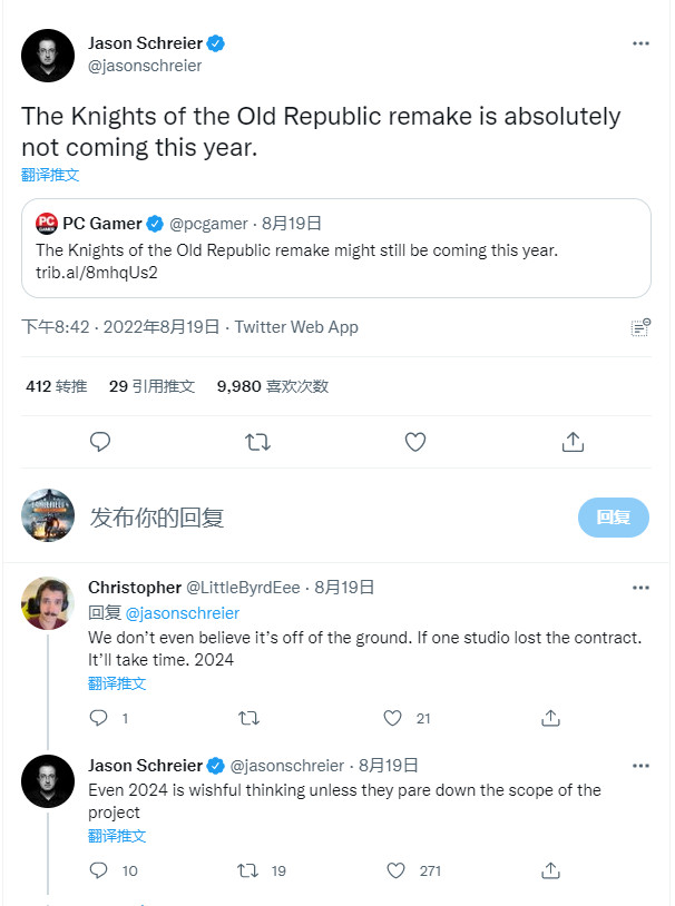 最近Embracer Group宣布他们的其中一个3A游戏已经转移到了另外一个内部开发商手里,考虑到之前就有报道《星球大战:旧共和国武士重制版》开发遇到了问题,因此外界普遍认为这个3A游戏就是《星球大战:旧共和国武士重制版》。虽然Embracer称该作没有经历重大延期,但看起来今年肯定不会发售。 在Twitter上,彭博社记者Jason Schreier回应了PC Gamer报道,后者称《星球大战:旧共和国武士重制版》今年发售。Jason回应说:“《星球大战:旧共和国武士重制版》今年绝对不会发售。” 当另外一个用户回应说这款游戏可能会在2024年发售时,Jason回应说:“即便是2024年也是一厢情愿,除非他们把这个项目缩水了。” 在令人失望的垂直切片后,《星球大战:旧共和国武士重制版》面临无限期内部推迟。原是辅助开发商的Saber互动将接管这个项目(原开发商是Aspyr),消息认识称2025年是一个更切合实际的发售窗口。该作登陆PC和PS5平台发售。 |