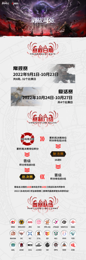 2022《永劫无间》职业联赛第二赛季即将开启,24名单排选手和24支三排战队在这里共同争夺冠军的荣誉以及260W的丰厚的奖金!