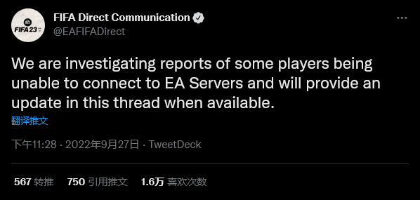 《FIFA 23》于昨日(9 月 27 日)以抢先体验形式正式发售,并面向那些购买了终极版的玩家提前开发。在开放后不久,游戏的服务求就停机了。这导致了游戏的“终极球队(Ultimate Team)”模式无法在 PS 和 Xbox 主机上正常游玩。 《FIFA 23》将在北京时间 10 月 1 日正式发售。虽然游戏原本应该在今天(9 月 28 日)开始,但是 EA Play 提前试玩提前了一天开始。 官方在服务器下线后迅速回应,27 日晚上 11 点,《FIFA》官方推特表示:“我们正在调查一些玩家无法连接到 EA 服务器的报告,并将在恢复后在这条推文下提供更新消息。” 直到今天(9 月 28 日)凌晨 1 点,官方对推文进行了更新,表示玩家应该已经能再次连接到 EA 服务器。根据 Eurogamer 测试,玩家现在已经可以正常游玩“终极球队”模式。 |