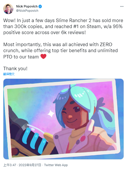 《史莱姆牧场2》开发商兼发行商Monomi Park联合创始人兼首席执行官Nick Popovich宣布,游戏销量现已突破30万份。本作的抢先体验版现已登陆PC及Xbox Series平台,首发加入XGP,目前在Steam上“好评如潮”,近七千条评价中有着95%好评率。