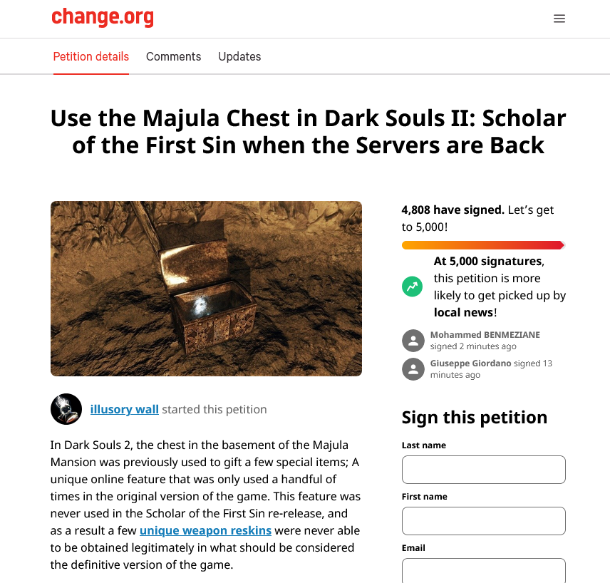 许多《黑暗之魂2》粉丝近日签署了一份请愿书,要求官方能够将 4 款作为宣传/促销商品的特殊武器添加回游戏当中。 魂系游戏内容创作者 Illusory Wall 制作了一段 YouTube 视频,展示了这些在游戏中存在但无法获得的武器。在《黑暗之魂2》推出时,FromSoftware 使用游戏中 Majula Mansion 地点的一个宝箱为玩家提供免费的物品和资源,这也包括一些特殊武器。 2014 年 7 月,开发者为玩家发放了一把丛云。虽然此前这把武器就已经存在于游戏中,但是这把开发者给予的拥有不同的皮肤。官方随后推出了 3 个不同皮肤的武器,包括黑铁武士刀、长剑以及巨棍。自从活动结束后,就再也无法获得这些皮肤了。 为了解决这个问题 Illusory Wall 在 Change.org 上发起了一个请愿书,试图让这些皮肤重新回到游戏中。目前,《黑暗之魂》PC 的服务器正在进行长期维护,因此他认为这是重新添加皮肤的最佳时机。 请愿书称:“这次服务器维护似乎是最后一次看到 Majula Mansion 箱子再次被使用的一个可能机会!如果有任何机会那么就是这次服务器重新上线的时候,某个人可能能够推出箱子的更新,我相信就是这样。”请愿目标为 5000 人,截至稿前已有 4800 多人签署请愿,且人数依然在不断增长。 |