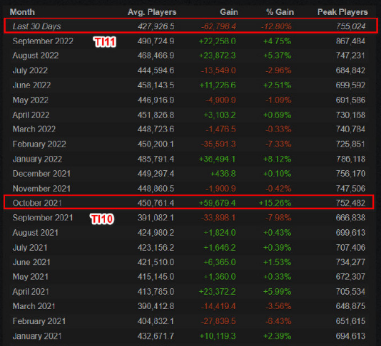 Dota2一年一度的电竞盛会Ti国际邀请赛,将于本周末决出最终的冠军队伍。从V社官方到普通玩家,对此都极为重视。只是跟现场观众们滔天般的热情不同,网络上“除客皆刀”的情况,在最近一个月变得更加严重了。 根据统计网站steamcharts的数据显示,10月份以来DOTA2客户端的平均在线玩家只有40万出头,比9月份还要低13%。如果放眼全年,10月也是平均在线玩家最少的一个月。搁平时,根本无法想象这种情况会出现在Ti正赛开始的月份。(往年玩家在Ti月都会增长) DOTA2客户端的玩家数据,似乎刺激到了V社,今日V社宣布将发放2022年国际邀请赛福袋。若要问这次活动的福利有多给力?刀友们普遍都在用“村里发金条”,来形容G胖难得的良心之举。 Dota2的官方公告显示:现在马上登录游戏、或者在勇士令状截止前任意时间皆可以直接领取三项奖励—— ①为期一个月的刀塔Plus ②一件1级勇士令状(已拥有勇士令状的话可以兑换24级勇士等级) ③自行选择商城中任意一件在售的至宝 毫不夸张地说,Dota2的这次活动在真正意义上促进了玩家回坑。从现在开始,所有Dota玩家只要在勇士令状活动期间游玩或已游玩10场游戏,就可以获得这些奖励,并且在1月结束前都能领取。 ——在周四这天,人们的关注点第一次从“KFC疯狂周四”,转移到了Dota2游戏当中。 商城在售至宝任选的诱惑,让流落在外的Dota2玩家重新返回了客户端。而这所带来的后果就是客户端不堪重负,直接“红蓝字”。这种服务器崩溃的情况,即便是V社员工都已经很久没遇到过了。因此很难用言语来形容他们,在这一刻内心之中是喜是悲。 在此前的Ti11淘汰赛期间,官方曾公布过一组奖池数据。1680万美元的金额,不及去年最终奖池数的一半,这说明了玩家对勇士令状热情的衰退。或许此次的活动,能让一些玩家重新对充本子等级产生兴趣,但Ti11的奖池金额超越去年的可能性却微乎其微。 Dota2还能坚挺多久目前还无法预测,但今日外网一个名为TylerMcVicker 的舅舅党却向外界透露,V社之前注册的商标《Neon Prime》将由Dota2原开发者冰蛙领导制作。最终的成品有可能是Dota2世界观下,基于起源 2 引擎的 RTS/FPS 混合游戏。 在接下来的几年,向来不会数3的G胖可能会用这款新的游戏,接过V社的大旗。 但不管后续情况如何,玩家们还是该把握当下吧,眼前的Dota2福利没领到的那都叫吃亏。鉴于服务器现在仍处于崩溃状态,没领到福利的人必须得更耐心一些。 |