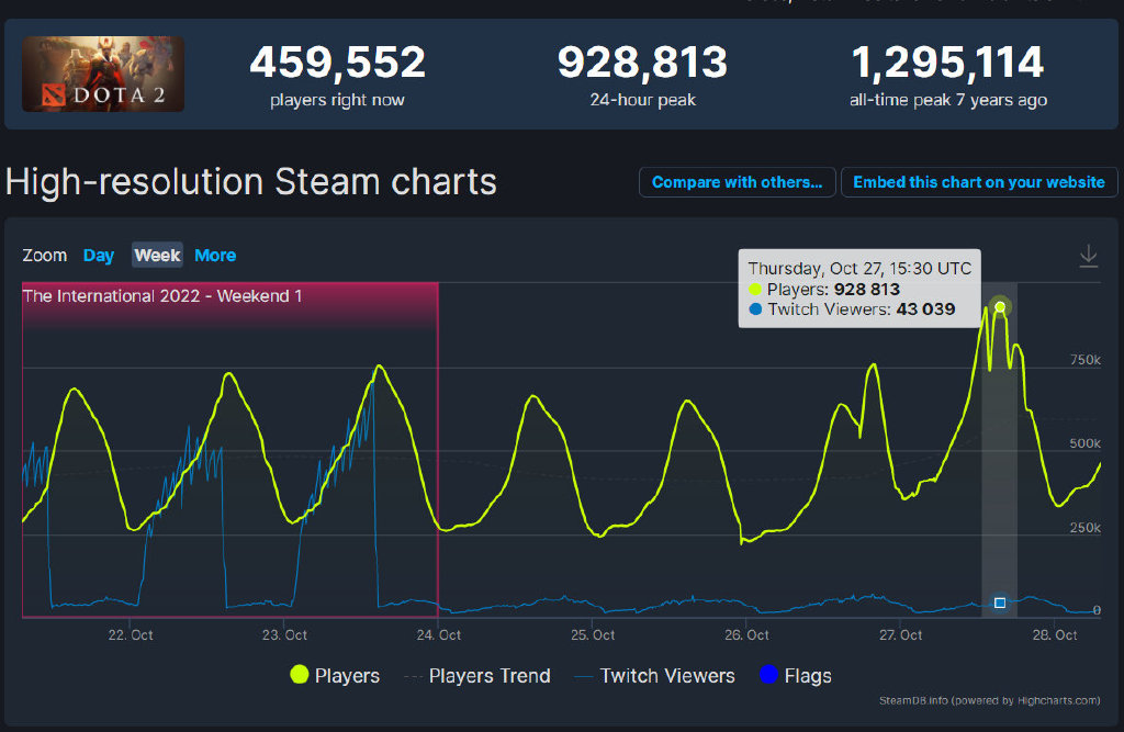 明日开始就是TI11决赛日,仅剩的中国队伍Aster,正试图从另外三支西欧队伍中突出重围,捧起那一面不朽盾。 不过相比于即将到来的精彩赛事,更多的玩家将目光放在了游戏本身之上。一改往日Dota2客户端的人气惨淡,最近两天回坑的玩家已经踏破了门槛。从昨日起开启,并将持续到1月份的福袋活动,当前已经让92万玩家重新登录了Dota2客户端。 按照目前的情形来看,Dota2的在线玩家数突破100万只是时间问题。唯一限制数据提升的因素也不是工作日,而是Dota2的客户端。相信不少刀友们,在这两天都没少体会被红蓝条支配的恐惧。 Dota2福袋为游戏所带来的玩家数增长是相当显著的,要知道本月的平均玩家在线人数,在福袋活动开始前只有42万(全年最低)。上一次Dota2游戏有这么多玩家涌入,还是2019年刀塔自走棋推出时。 如今自走棋已经凉得差不多了,未曾想V社光凭一个活动,就能让玩家们重新聚集起来。 本次的Dota2活动所吸引来的玩家不仅仅体现在数据上,由于领取奖励需要开10把游戏,这两天不同模式的匹配速度都有了明显提升。stratz网站为此统计了各大服务器的新增对局场数,结果得出了以下结论—— 中国区服务器:+31%匹配局数 北美区服务器:+56%匹配局数 欧洲区服务器:+30%匹配局数 东南亚区服务器:+41%匹配局数 南美区服务器:+34%匹配局数 那种排队10秒就能进入BP界面的感觉,Dota2玩家们已经很久没有体会过了。 此次的福袋活动中,任选一个商城在售至宝的奖励,还影响到英雄本身的BP率。又或者换种说法:本周被选比例提升最多的英雄,同时也对应着玩家们领取至宝的比例。在最近几天,一场对局十个至宝的情况并不罕见。 V社的这波操作堪称“云玩家消灭计划”,丰厚的奖励真正实现了引流和让人回坑的效果。多少年了,回归玩家和萌新玩家再次出现在了同一场对局中。有了这次活动,接下来的两个月,V社也无需担心游戏的月活了。 当前,Dota2的客户端依然处于不稳定状态。V社甚至为此还新增了一条弹窗警告:“福袋商店现在很忙,请晚些时候再试。”鉴于活动时间还有很长,因此玩家们倒也不必急于一时。 那么大家这次选择回坑了吗?最后又选了什么至宝呢? |