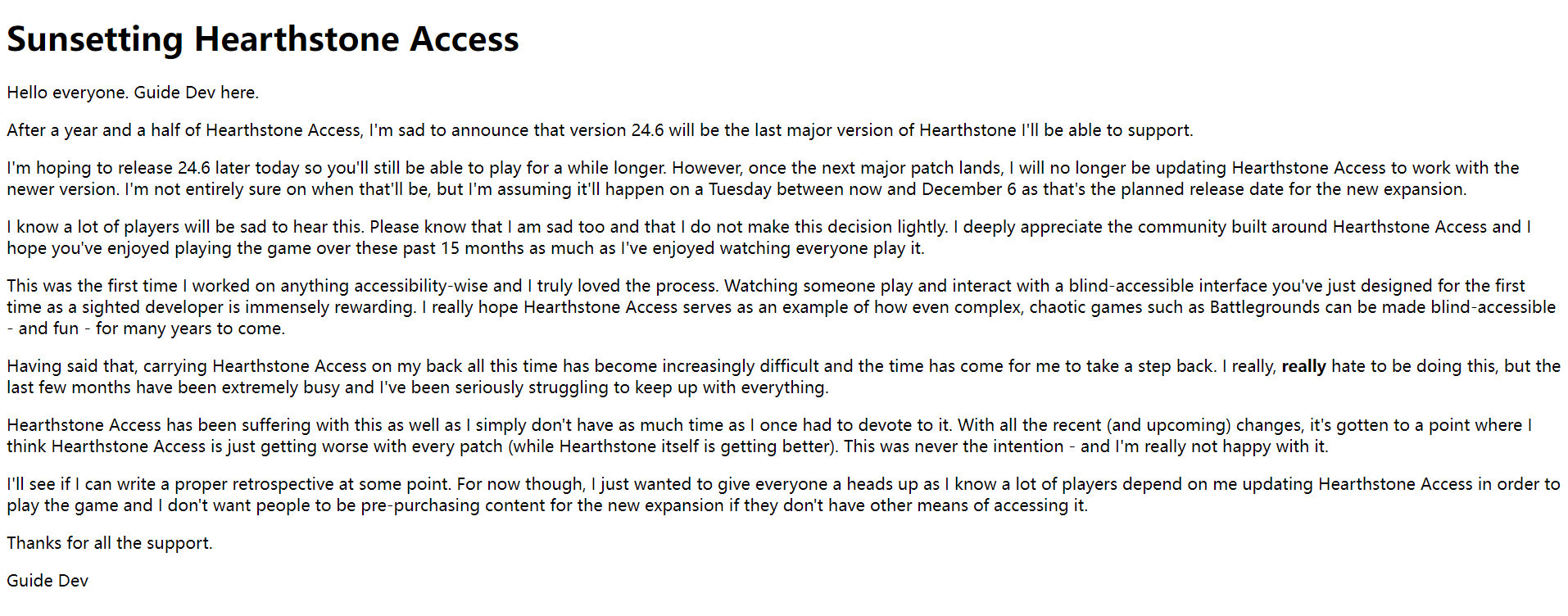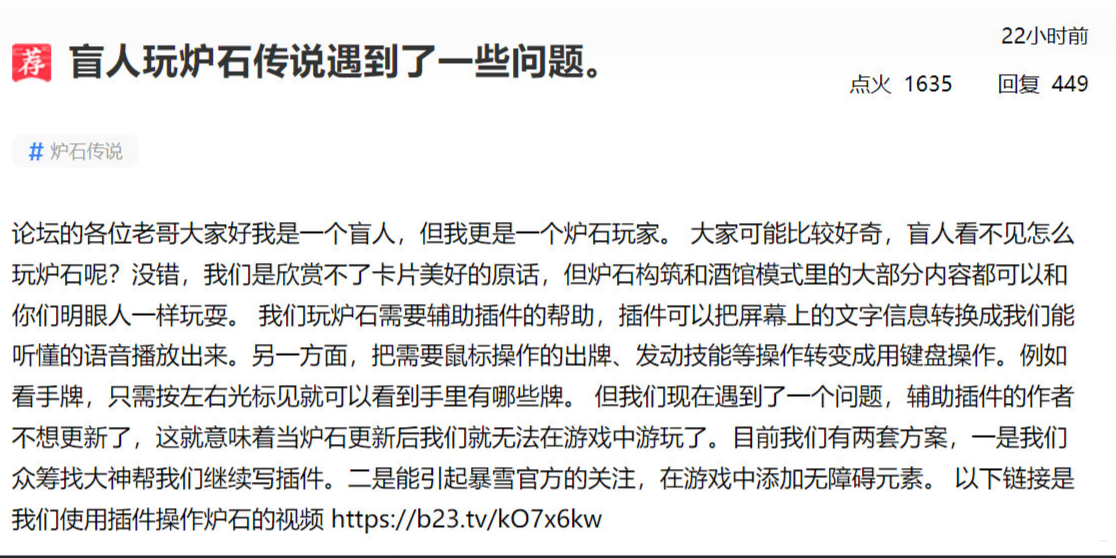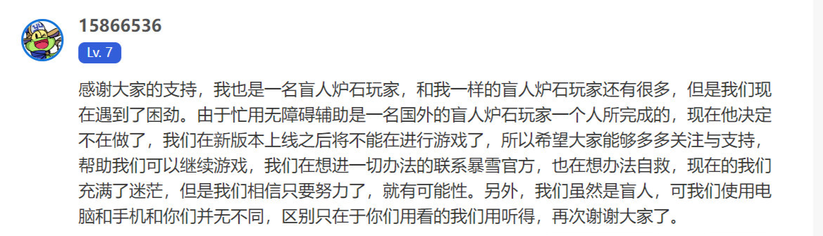 盲人玩游戏?普通玩家听到这句话,第一反应可能会觉得这是天方夜谭。毕竟在常人的认知中,看不见屏幕上的东西,也就失去了游戏的乐趣。可事实并非如此,在过去的很多年里,炉石玩家群体中都存在着一批盲人玩家。 他们借助能播报屏幕内容、牌组、卡牌效果,靠键盘快捷选牌的特殊插件,能够进行正常的对局。假以时日熟练后,甚至能达到跟正常玩家对抗的水准。而这一切,都得归功于插件开发者 Guide Dev。 可因为暴雪近期对《炉石传说》的内容更新越来越频繁、改动内容越来越多,用爱发电的Guide Dev一个人实在是有些独木难支。在前些日子《炉石传说》的24.6版本更新以后,他在推特上正式宣布,这将会是他的最后一次更新。 此消息一出,全世界靠着这个插件才能体会到《炉石传说》这款游戏乐趣的盲人玩家,一下子就慌了神了。中、外的《炉石传说》论坛上,也都出现了讨论这件事、向暴雪请愿的帖子。 一方面大伙希望有其他的大神或者组织能接手后续的开发;另一方面也期待暴雪能够站出来,为《炉石传说》推出无障碍系统,以解决盲人玩家的难点。而网友们所能给到的帮助,就是予以这件事持续关注。 客观来说,想要接手这套无障碍系统,并不是一件简单的事情。不管是对开发者还是盲人玩家来说,《炉石传说》的版本更迭都是一大考验。 内容描述复杂、冗长的特殊牌组,本就会给到盲人玩家极大的压力。因为不能像普通人那样看到牌面,所以他们每一场对局都需要在4倍速的语音播报下,靠脑子来记住手牌内容,再与其他玩家进行对抗。 大家只要想象一下,通过语音播报的形式了解死骑的各种机制。这别说是盲人玩家了,就算是正常玩家也会感到头皮发麻。 当前,《炉石传说》社区的经理已经向暴雪反馈的这个问题。然而事情是否能成,却仍是个未知数。因为可能连暴雪事先都不知道,《炉石传说》居然存在这么多盲人玩家,打一开始就没有考虑过将无障碍系统应用到游戏中的可能性。 而Guide Dev遇到的问题,暴雪也同样得面对,或许还需要花更多的时间和精力。 这场为了帮助盲人玩家而发起的请愿,现在仍在继续。如果能成功的话,未来势必能帮助到更多的人,体会《炉石传说》的乐趣。别说游戏没有感情,在虚拟的网络世界中,许多玩家其实比现实中的人更有温度。 希望这件事最终能得到妥善的解决吧~ |