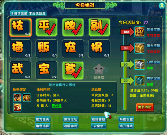 《醉红楼》新区【月满长安】各项活动正在火热开启中,新区冲榜、新区冲级各种好礼等你来拿~《醉红楼》除了各种新区活动之外,主线任务和日常故事也是极其丰富有趣的,今天就给大家说说技艺堂修炼的小技巧吧,助力玩家在新区旗开得胜,各种奖励统统拿到手! 在新区如果不知道那里可以获得大量经验升级,技艺堂一定是你的不二之选。在金陵城NPC贾代儒处每天都可以领取十次技艺堂修炼任务。在前期,技艺堂提供的经验可以让人物和宠物快速升级,并且技艺堂修炼相对其他日常来说还是较为简单的,且还有许多趣味在其中哦~ 为什么说技艺堂是大量获取经验的方式之一呢?首先,技艺堂任务奖励的经验是随着等级的提升上升的,不是一成不变;其次,任务积累的积分可以获得挑战云游道人的即会,可以获取额外的经验和金票;最后,云游道人任务可以组队,这样一个队伍便可以有数十次的任务循环了。这样刷任务,一周下来就有几百万的经验了! 如果你没有那么多的时间去刷循环任务,那么你也可以这样去做技艺堂的修炼。每天五次技艺堂修炼可以获得15个活跃度值。有些任务,如打猎、记忆水晶等,很耗时间。你可以在找到NPC进入任务界面之后,选择逃跑的选项。这样,任务虽然没有完成,但是还是可以获得活跃度,大大地节约了任务的时间,也不会影响下一轮的任务。 说了这么多还是需要大家在游戏里真正体会一下,这样才能找到自己刷任务的节奏,最后预祝大家在《醉红楼》新区【月满长安】玩的开心~ |