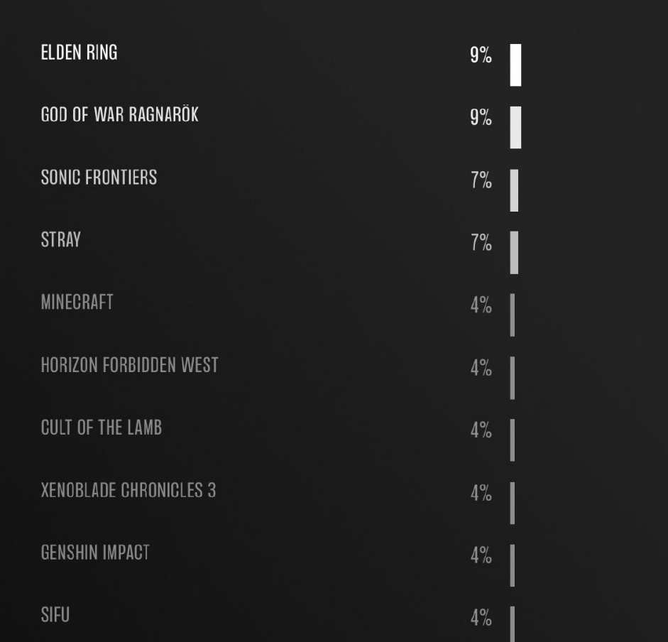 北京时间12月9日,一年一度的“游戏界奥斯卡”盛典TGA 游戏展就将迎来正式揭幕。而在多达数十种涵盖不同名目的奖项中,如果说“年度最佳游戏”代表的是最具含金量的奖项,那么“玩家之声”投票,就是予以最受玩家欢迎的游戏作品的褒奖。 每年的TGA游戏展上,都会设置多达数十个奖项,但其中几乎所有的奖项评选,都需要由全球各大媒体和陪审团进行商定后才能下结论。其中,玩家投票所占的比重,只有可怜的10%。所以从严格意义上来讲,普通玩家对TGA奖项的评定所能造成的影响相当有限。 但“玩家之声”却是个例外,这是一个完全由玩家投票结果,来决定其最终归属的奖项。而今年的“玩家之声”投票,早在11月29日便已经开启。经过一番角逐,目前两大“年度最佳游戏”的有力竞争者《战神5》、《艾尔登法环》,以9%的得票率并列榜首。 不管是从游戏体量、玩法、宣发力度还是背后的发行商的实力,《战神5》与《艾尔登法环》都是势均力敌的对手。它俩无论放在哪一年,都有可能摘得“年度最佳游戏”这项荣誉。 将丰富的游戏内容,高超的制作水准结合在一起,这两款作品几乎没有瑕疵。而撞在同一年发售,则必定会有一方要带着遗憾离开。 通常情况下,热度和曝光率高的游戏都更容易在玩家投票方面取得优势。可今年的情况却是,《战神5》与《艾尔登法环》都有着大量忠实拥趸。不过考虑到《战神5》只在主机平台发布,《艾尔登法环》面向的却是全平台。因此前者的受欢迎程度,甚至还要更胜一筹。 当然,这里并不是想引起平台之争,结合近期屡屡登上Steam周销榜的《战神4》的事例,《战神5》登陆PC平台也不过是时间问题。现阶段“玩家之声”的投票结果,更多是在表明玩家们对《战神5》与《艾尔登法环》两款作品,都有着很高的期待。 玩家们通常是感性的,很多时候会以个人好恶来进行投票。过去三年的“玩家之声”投票结果,分别是《火焰之纹章 风花雪月》、《对马岛之魂》和《光环:无限》,但当年的“年度最佳游戏”却是《只狼:影逝二度》、《最后生还者2》以及《双人成行》。 换而言之,今年的“玩家之声”投票结果与“年度最佳游戏”的候选作品几乎完全重合,这就让一切显得愈发难得了。 那么在大家心目中,“玩家之声”与“年度最佳游戏”奖项应该给到谁呢? |