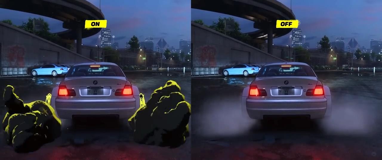 《极品飞车:不羁》开启/关闭卡通效果后,最大区别就是烟雾效果。没了卡通效果,烟雾看起来平平无奇。本作已于12月2日发售,登陆PC、PS5、XSX|S。
