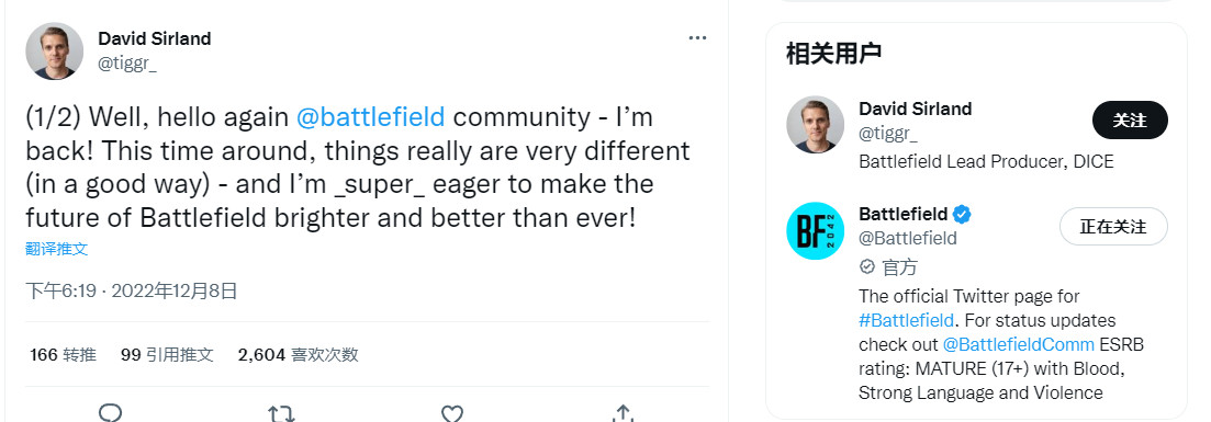 前《战地4》制作人David Sirland将回归DICE领导开发《战地》系列。 在Twitter上,Sirland公布了他的回归消息。这名前《战地》制作人透漏他将领导该系列。 Sirland和《战地》系列有很长的渊源。他最早参与开发了2005年的《战地2》,随后开发了《战地:叛逆连队》。此后退出了DICE,在回归后,开发了《战地4》,制作了《战地1》和《战地5》。 目前尚不清楚Sirland这次回归DICE后将担任什么角色。 虽然《战地2042》是该系列口碑最差的游戏,但Sirland称赞该作发售后DICE的持续改进工作。 “《战地2042》开发团队应该就游戏当前的状态而获得很多很多的称赞。有很多事情在诱惑我回归,我非常渴望要出发了。” 显然,Sirland的回归标志着DICE的一个转折点,并传达了一个明确的信息——工作室想要赢回《战地》粉丝的信任。 |