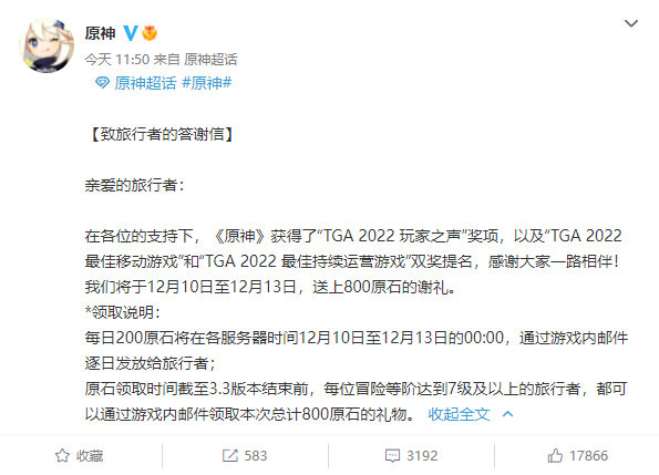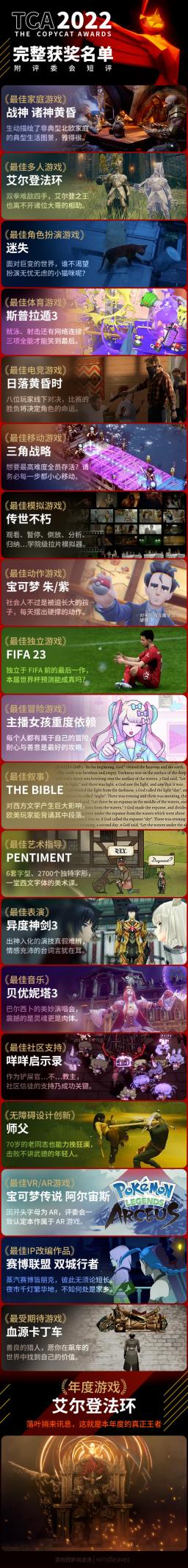 12月9日,万众瞩目的TGA 2022游戏颁奖典礼迎来了正式开幕。这场汇聚了全球最杰出游戏作品和厂商的盛会,跟往年一样得到了游戏界最高规格的关注。而经过连日以来,评审团综合各项要求及玩家意见进行的选拔,诸项大奖的归属都已确定。 《艾尔登法环》击败《战神5》拔头筹 早在今年2月份游戏发布时,许多玩家便笃定宫崎英高能再次登上领奖台,但后续《战神:诸神黄昏》的发布,却给【年度最佳游戏】奖项的归属增加了许多不确定性。 直到主持人宣布获奖者以前,网上对这两款游戏的支持率都无限接近于五五开。而最终,首次将开放世界融入到魂类游戏中的《艾尔登法环》还是笑到了最后。并且不单单是【年度最佳游戏】奖项,《艾尔登法环》还获得了包括【最佳艺术指导】在内的多项大奖。 尽管在台下是竞争对手,但《艾尔登法环》获奖后的第一时间,《战神:诸神黄昏》的开发工作室圣莫妮卡就发来了贺电表示祝福。实际上在很多玩家的心中,它俩都是品质不分上下的优秀游戏,只不过在评奖时,一方差了些许运气罢了。 值得一提的是,在颁奖过程中还发生了个小插曲:在一众游戏圈大佬面前,陡然出现一位所有人都不认识的黑衣小伙,此人上来就发表了一段讲话,让观众们都处于懵圈状态。 而后知后觉的主办方在发现小伙是路人乱入后,迅速对其进行了“逮捕”。这也是今年的TGA上,发生的最大的“直播事故”了。 《原神》击败《索尼克》获得玩家之声奖项 【玩家之声】作为TGA诸多奖项中,唯一由玩家投票决定的奖项,近一周以来《原神》玩家和《索尼克:未知边境》玩家吵得不可开交。这两大粉丝群体在网上针锋相对,争相为自己喜欢的游戏拉票。随着网上的形势愈演愈烈,中途甚至还被曝出存在刷票的情况。 但《原神》还是更胜一筹,成为了主持人【玩家之声】的真正得主。主持人在宣布名单时,甚至还提到了“after removing all of the bot votes”(剔除机器人投票后)这一关键要素。 从某种角度来说,这场较量称得上是国产游戏和最受欧美观众欢迎的游戏IP之间,所爆发的反响最热烈的一次“冲突”。 此次的TGA 2022,《原神》除了【玩家之声】奖项之外,还摘下了【最佳持续运营游戏】奖项。在过去的两年中,米哈游用密集且优质的更新内容,征服了全世界的《原神》玩家,并展现出了极强的吸金能力。 跟往年一样,《原神》获奖后米哈游的第一反应,就是给玩家们发福利,承诺将会在未来三天,奉上原石作为谢礼。 ——在一张票换800原石这项买卖上,玩家们向来都是稳赚不亏的。 TGA 2022上拳头公司又赢麻了 TGA 2022是一个综合性质很强的游戏盛会,如今已蓬勃发展起来的电子竞技,自然不会被忽略在外。本届TGA上有关电竞领域的奖项有很多,可仅凭拳头这一家公司就包揽了其中的绝大部分奖项。 《瓦罗兰特》这款FPS游戏,获得了【年度最佳电竞游戏】、【年度最佳电竞选手】、【年度最佳电竞队伍】、【年度最佳电竞教练】这四项殊荣,【年度最佳电竞赛事】则给到了不久前才结束了S12英雄联盟全球总决赛。 在欧美地区,《瓦罗兰特》的影响力正在渐渐超越《英雄联盟》。后者作为一款运营12年的长寿游戏,如今已经不可避免地走起了下坡路。现在的拳头公司,似乎正打算对公司旗下的招牌产品完成“权力交接”。TGA的获奖情况,也从侧面说明了这点。 此外,《英雄联盟》改编动漫《双城之战》,还击败了大热的《赛博朋克:边缘行者》,成为了【年度最佳游戏改编作品】。集多项大奖于一身,拳头公司也因此成为了本届TGA上风头最盛的厂商。 结语: 一年一度的TGA游戏颁奖典礼,被称作“游戏界的奥斯卡”。每年玩家们都会见证一批作品“封神”,当然也会看到更多的作品铩羽而归。 图源:游戏假资讯速递 但相比于获奖,一款游戏能否给玩家带来深刻记忆,让玩家有所感悟,其实才是最重要的东西。为玩家带来欢乐、帮助玩家体验不一样的精神内核与视听内容,或许才是游戏开发者们潜心创作与开发的真正意义。 那么大家又是怎样看待TGA 2022的颁奖结果的呢? |