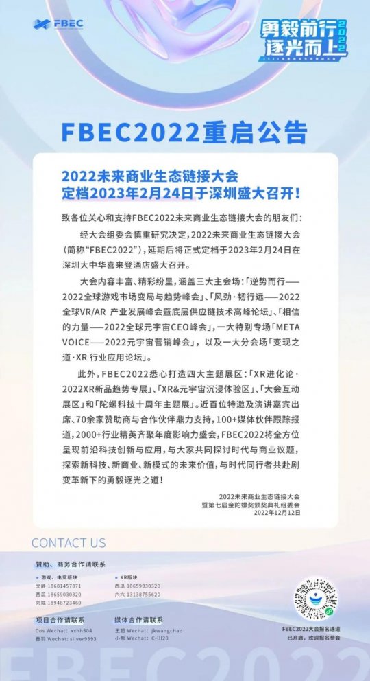 第七届金陀螺奖设立游戏类、XR&元宇宙类和电竞类三大类奖项,共计30+奖项类目,经过为期近3个月的报名参评、线上投票、专家评审后,获奖名单于今日重磅揭晓!金陀螺奖作为年度行业影响力大奖,受到业界的广泛参与和认可,旨在表彰鼓励勇于创新、开拓进取的行业从业者们! 本届金陀螺奖以线上投票+权威第三方机构数据榜单+专家评审团三个维度进行综合评选,倡导从业者进取突破,甄选推动促进行业前沿创新与可持续发展的优质企业或项目。第七届金陀螺奖参评阶段总计394个企业、个人、项目参评报名,累计投票总数超80W+。 以下是第七届金陀螺奖最终获奖名单,让我们共同见证行业中的勇毅前行者们! 即将过去的2022年注定是不平凡的一年,游戏从业者勇毅前行,持续突破,展现出游戏带来的无限可能。以下公布的金陀螺游戏类获奖名单,正是今年值得记录的代表。 和过去一样,我们继续以见证者的角色,为作出突出贡献的企业和游戏颁发金陀螺奖。不同的是,今年金陀螺奖增设“年度优秀文化传承游戏奖”、“年度优秀游戏工作室”等新奖项,以此鼓励那些有特殊意义且过去被忽视的中坚力量。 电子竞技正在成为影响一代人的新兴文化符号,从小众走向主流,从竞技形态走向体育项目。站在电竞高速发展的关键节点上,第七届金陀螺奖电竞类奖项围绕“电竞赛事”、“竞技游戏”、“电竞直播”三大维度,对2022年电竞行业发展进行全面回顾的同时,更是秉持着为电竞行业持续赋能的理念,对这一年来对电竞行业做出创新和贡献的赛事、产品和企业进行表彰,为电竞行业挖掘出更多发展新方向。 “元宇宙”在2022年已经不算是新兴概念,即便大多数人可能还不理解它的完整定义,但这个词汇已几乎人尽皆知。集成了众多高新技术的元宇宙自2021年炒热之时起,就与XR行业深度绑定,因此往年金陀螺奖的“XR类奖项”也在今年拓展为“XR&元宇宙类奖项”。 具体奖项设置在往年的基础上增设“虚拟人”和“元宇宙”两大方向,表彰技术创新和杰出贡献,并向相关企业、产品予以鼓励。即便现在距离真正的元宇宙还很遥远,但行业中这些优秀企业的每一步脚印,都是向着共同理想迈出的坚实一步。 重启!FBEC2022未来商业生态链接大会 定档2023年2月24日在深圳盛大召开! 2022年是大考的一年,面对跌宕起伏、充满不确定性的“超验时代”,优秀的创业者们并未停下脚步。他们高瞻远瞩,透过变化,预见行业的变革动向;他们自我革新,不惧冒险,成为推动商业文明进程的行动派;他们触摸前沿,壮志蓬勃,带领整个产业迈向新征程。 我们希望把创造历史的主角邀至台前,携手交付那份关乎未来的答案。因此自2017年创办以来,金陀螺奖一路注视着同伴们的点滴成长,记录着行业的观点与经历,挑战与突破,致力为每一件优秀作品铸造荣耀的象征,也为生猛闯入的新人勾勒梦想的形状。 在历史篇章中,我们经历了流量的变迁,感受着技术的日新月异,也见证了产品的推陈出新。金陀螺奖自开设以来,累计吸引参赛项目近万家,评选出上千个优质项目。我们希望,通过对行业的优质作品和企业做出嘉奖,鼓励创业者、从业者们不断进步,突破自我,推动行业发展。 属于未来的崭新画卷正在徐徐展开。在以元宇宙为主导的行业发展热潮中,勇敢者的探索和发现正为未来世界打开光明的通路。共谋长期发展趋势,突破核心技术壁垒,创新应用场景,实现思想突围,则是构建未来世界形态的关键一步。 勇毅前行,逐光而上 愿创业者们在风云变幻的的市场环境中 坚定信心,携手同行,勇攀高峰! 关于FBEC2022 |