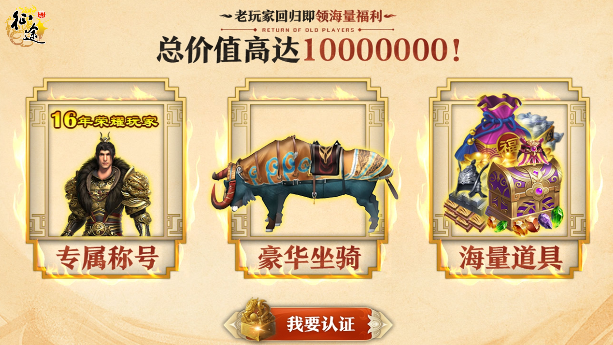 提及“征途”,你最先想到的是什么? 是热血激昂的国战,无限原地复活,实现杀敌“百连斩”! 是大哥那以一敌百的英姿,和兄弟一起出生入死,共筑荣光! 还是首创给玩家发工资的先例,千万福利豪礼倾情相送! …… 现在,这些记忆皆可原汁原味的复刻重现!12月15日《原始征途》终极测试“十万大服”荣耀开启,老史力邀十万玩家一起奔赴这场跨越17年的征途之约。在这里,你不仅可以享受大哥带队、10万人同屏争霸的畅快爽感,更可以通过老玩家身份认证,瓜分1000万基金豪礼! 【老玩家回归·寻觅征途记忆领豪礼】 《原始征途》为老玩家回归特别准备了典藏级福利豪礼!点击下方的活动链接,一键完成认证领取“荣耀玩家”专属称号、豪华坐骑等海量福利道具!只要你还持有巨人通行证,只要你是征途系列游戏的爱好者,只要你血脉中还流淌着征途之魂,即可立即参与活动赢取价值1000万的回归福利! 同时,认证成功后你还将获得自己的独家征途记忆。你是否还记得与征途相伴了多少个日夜,是否还记得与这些兄弟因何相遇,是否还记得昔日征战四方的飒爽英姿?无论岁月如何变迁,征途始终在这里与你相伴相随! 【大哥带队·17年经典IP再续前缘】 征途老玩家大型纪录片《征心英雄》先导预告震撼来袭,千浪怡陶苑、风云HuMan、暴风seven...这些鼎鼎大名的玩家也都将悉数与大家见面,听大哥忆往昔峥嵘岁月,讲述难以割舍的征途情。同时,大哥们也将入驻《原始征途》12月15日开启的终极测试区——“十万大服”,还在等什么?快来和大哥一起重温当年的征途热血岁月吧! 【兄弟集结·福利升级赢iPhone14】 什么?除了以上两大福利,《原始征途》还有豪礼相赠?邀请老友一起回归完成认证还可获得抽奖机会,iPhone14、征途x黄金酱酒礼盒、定制充电宝等缤纷大礼你不容错过!参与认证或每成功邀请1名玩家进行回归认证,皆可获得1次抽奖机会,若该玩家符合回归标准,则获得的抽奖机会翻倍,更多活动详情可前往活动页面进行查看。 12月15日《原始征途》终极测试“十万大服”荣耀开启,老玩家回归惊喜福利多多,你还在等什么呢?把这个好消息分享给兄弟,大家共同开启一段热血的征途之旅! |