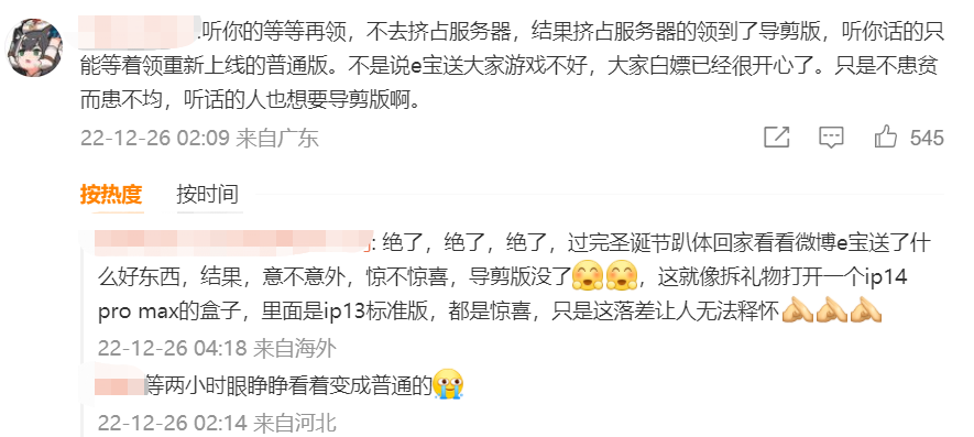 虽然在几天前,就有人曝光了Epic的圣诞大礼是《死亡搁浅》,但让人没想到的是,它居然把新鲜出炉的《死亡搁浅》导剪版拿出来免费送了!更让人没想到的是,这份圣诞大礼居然还是Epic员工的误操作,只有那些熬夜领游戏的玩家才能享受到! 根据玩家的爆料来看,Epic平台在12月26日凌晨开放免费游戏领取时,于第一时间送出了《死亡搁浅》的导演剪辑版。然后直到数个小时之后,才有人发现他们送错了游戏,紧急将导演剪辑版替换成了普通版本。也就是说,在你安心睡觉等着领Epic免费游戏时,已经错过了白嫖《死亡搁浅》导演剪辑版的最佳时机。 要知道在Epic平台上,《死亡搁浅》导剪版的价格为208元,原版价格仅为88元,而在游戏内容上两者的差距也颇大,导剪版新增众多对新手友好的装备与载具,还有大量新场景跟联机新玩法。所以,Epic这波“背刺”的操作让玩家直呼看不懂。 对此,不少玩家都表示心里很不平衡,因为Epic平台官博曾在第一时间告诉玩家服务器有点崩溃,可以在明天白天再领,结果很多人就因为信了这个鬼话,眼睁睁地看着自己的导剪版变成了原版。 现在Epic官方微博的评论区已经被大家给冲炸了:“听你的等等再领,不去挤占服务器,结果挤占服务器的领到了导剪版,听你话的只能等着领重新上线的普通版”,“你这送导剪版让后面领普通版的人怎么想???”,“你可以不送,但是别人领到了,而我是因为你们服务器崩了而没领到,我可要攻击你了”…… 不得不说,大e老师顺风局还能打逆风操作,确实是大家是没想到的,也不知道Epic平台最后会进行什么样的补偿操作,又或是完全不操作了。 |