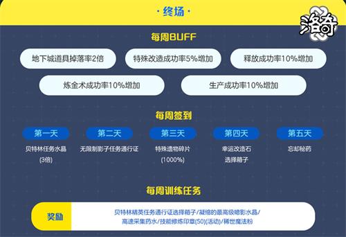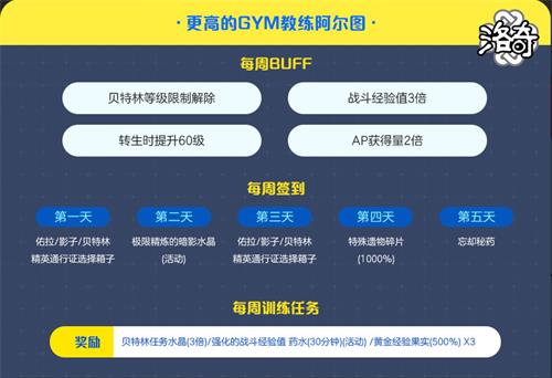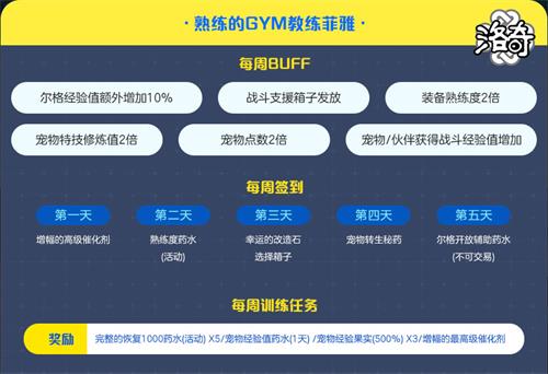 这个冬季,你想变得更加强壮吗?要不要与优娜对话绑定代表角色一起修炼?我们为代表角色准备了训练能量饮料(活动期间内:防御10、保护5、魔法防御10、魔法保护5魔法值500、体力值500、生命值500) 【枯燥的冬季】 ●修理费100%免费 ●转生秘药每周三领取 ●宠物租赁雷兽(90天) ●活动期间内物品栏租赁 ●英雄才能免费转生 ●科隆巴斯每周奖励获得限制10次→12次 ●领主任务每日完成限制3次→5次 ●亚凡骑士团每日进入限制3次→5次 【请选择一位负责本周训练的健身教练】 每周健身爱好者:从教练准备的BUFF中选择你需要的BUFF 狂热周末福利:除了教练准备的BUFF还有额外的周末BUFF 暴风般的升级 更高的GYM教练 巩固修炼的强悍 更强的GYM教练 坚持不懈的成长之路 熟练的GYM教练 爬的更高吧! 特别的GYM教练 *查看教练的课程和BUFF并做出选择,一旦选择,将维持到下周三上午7点,请慎重选择! 【狂热周末福利】 周六/周日/周一开启 ●回音石升级成功概率10%增加 ●释放成功率10%增加 ●炼金术成功率10%增加 ●生产成功率10%增加 ●特殊改造成功率5%增加 【周末Ontime奖励】 12.17 周六 拉蒂卡战斗经验值药水(活动) 尔格开放辅助药水(活动) 训练印章 20个 12.18 周日 魔法释放保护药水 尔格开放辅助药水(活动) 训练印章 20个 12.24 周六 宠物转生秘药(活动) 尔格开放辅助药水(活动) 训练印章 20个 12.25 周日 贝特林精英任务通行证指定箱子 尔格开放辅助药水(活动) 训练印章 20个 12.31 周六 幸运的棱镜选择箱 尔格开放辅助药水(活动) 训练印章 20个 1.1 周日 技能修炼印章(50)(活动) 2个 尔格开放辅助药水(活动) 训练印章 20个 1.7 周六 黄金经验果实(5000%) 尔格开放辅助药水(活动) 训练印章 20个 1.8 周日 一代宗师黄金证书(活动) 尔格开放辅助药水(活动) 训练印章 20个 1.14 周六 解除专用药水(活动) 尔格开放辅助药水(活动) 训练印章 20个 1.15 周日 战术装备栏使用券箱子(30日) 尔格开放辅助药水(活动) 训练印章 20个 1.21 周六 评论印章(250)选择箱10个 尔格开放辅助药水(活动) 训练印章 20个 1.22 周日 至尊战斗经验药水(30分钟)2个 尔格开放辅助药水(活动) 训练印章 20个 1.28 周六 保护的改造石选择箱 尔格开放辅助药水(活动) 训练印章 20个 1.29 周日 附有神秘气息的精灵石(300%) 尔格开放辅助药水(活动) 训练印章 20个 2.4 周六 噩梦的暗影水晶 3个 尔格开放辅助药水(活动) 训练印章 20个 2.5 周日 装备耐久度提升水晶锤 尔格开放辅助药水(活动) 训练印章 20个 春节Ontime奖励 1.23 周一 皇家学院水晶(不可交易) 5个 1.24 周二 亚凡骑士团的训练石 [难度-困难普通] 1.25 周三 贝特林精英任务通行证指定箱子 1.26 周四 拉蒂卡战斗经验值药水(1小时) 1.27 周五 幸运的棱镜选择箱 【GYM训练印章商店】 完成每位教练的任务后,会获得训练印章。把它交给优娜,可以兑换各种道具。 【为了阿尔卡纳的到来做好准备!】 想要获得阿尔卡纳才能需要更多的经验才行。你愿意和优娜一起修炼吗? 为了迎接阿尔卡纳的到来,努力修炼才能让自己变得强大吧~ |