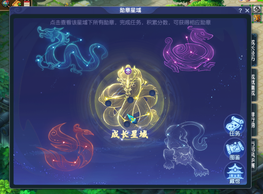 梦幻西游2022年全新资料片《撼海狂龙》已经上线一段时间。 新资料片带来的全新勋章系统,少侠们都体验过了吗? 今天,就让我们一起来了解一下吧。 星辰勋章系统,在司命星君处开启。 开启后的勋章系统,和成就系统在一起,可通过Alt+N打开成就界面,查看我的勋章、勋章星域。 勋章星域内以青龙白虎朱雀玄武四象,加上金龙,共分为5种星域,分别是成长星域、风尚星域、创造星域、竞技星域、挑战星域。 每个星域内又设有不同的细分勋章,部分勋章还拥有多个等级。 勋章可以通过做勋章任务,累计积分解锁、升级。 这五个勋章星域中,成长星域对应的是角色成长、生活技能、法宝修炼、灵宝修炼、神器修复等关于角色基础实力的内容。 勋章任务也主要是各方面的能力提升。 风尚星域主要对应的是锦衣、祥瑞、染色等外观相关的内容。 勋章任务主要是各种锦衣、祥瑞的收集及染色等。 创造星域主要是一些召唤兽捕捉相关的内容。 勋章任务主要是捕捉各种召唤兽。 挑战星域,主要对应的是一些与通关副本相关的挑战任务。 竞技星域,主要对应的是一些PK玩法相关的任务。 完成勋章任务,解锁并佩戴勋章,一方面可以用来展示自己的实力,秀出自己的肌肉。 另一方面,这个勋章系统,也可以当作一个成长规划。 玩家可以通过这种模式,给自己设定阶段性的提升目标。从而在实现目标后获得成就感和满足感。 各位玩家可以根据自己的玩法兴趣和喜好,选择自己计划提升和解锁的星域,并设置目标勋章。 当然,如果你不清楚自己的日常参与较多的玩法,属于哪一个星域的话。 可以开启勋章系统时,在司命星君这做测试。 司命星君会根据你的玩法偏好,帮你测试性格喜好,给你推荐适合你重点提升的星域。 如喜欢自我提升的人,更适合成长星域; 喜欢穿着打扮的人,更适合风尚星域; 喜欢收集创造的人,更适合创造星域; 喜欢挑战困难的人,更适合挑战星域; 喜欢竞技切磋的人,更适合竞技星域。 所以各位少侠,你的性格喜好是什么呢? 快来看看,你是属于哪个星域的星君吧~ |