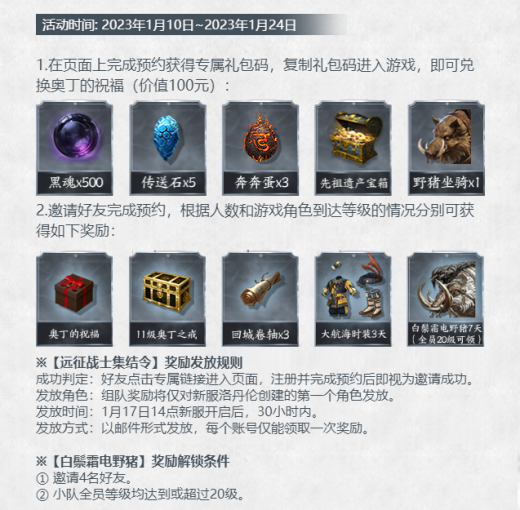 1月10日14:00 泰亚史诗周年新区 【洛丹伦】预约重磅开启 周年大版本《最后的维京人》全面席卷泰亚大陆 【巴伦雪山】的探险地图徐徐展开 【雪山凶兽】在暴风中发起进攻 【神秘符石】开启技能定制玩法 挥舞战斧与巨龙厮杀的维京记忆 在全新场景、全新挑战、全新玩法、全新剧情中 被悉数唤醒...... 【洛丹伦】是一个充满机遇的新王国 六重福利宝箱 等待各位远征勇士集结夺取 来吧 用战利品装满航船,开拓新的维京疆土 上船,一起干票大的! 第一重福利:新区预约有礼 1月17日新区【洛丹伦】正式启动 预约即可获得价值100元的【奥丁的祝福】礼包 签到就送【战羊坐骑】礼包 助力征战所向披靡 邀请好友组成远征小队 还能获得限定版【大航海套装】、【白鬃霜电野猪坐骑】等珍稀奖励 第二重福利:周年庆典有礼 1月11日 泰亚史诗1周岁生日预热活动准时开启 活动期间 城主红包雨每晚准时降落 还有小猪争夺、财宝追击等多种玩法 全新地图副本将掉落更多珍稀道具 周年专题活动页面 将于泰亚史诗官网同步上线 第三重福利:企微蒂法有礼 橡木酒馆的蒂法 是泰亚冒险者们最可靠的伙伴 1月17日、18日、19日 每天20:00 她将通过企微小程序 向冒险者准时发放6000元现金红包 第四重福利:吟游诗人有礼 泰亚史诗为培养未来优秀游戏主播 而启动的“吟游诗人计划” 登陆新区【洛丹伦】 随时随地,想播就播 所有奖励金都会从吟游诗人百万奖金池中发出 以人民币的形式结算 且每周都会结算一次 全新“吟游诗人计划”刚刚开启两周 已向主播成功发放奖金十万余元 即可进入吟游诗人报名页面 新区主播,即刻上船,干票大的! 第五重福利:指挥大赛有礼 第三届最强指挥大赛将在新区【洛丹伦】如约而至 1月20日准时打响第一场领地战 抢领地,夺王城,瓜分10w奖金 赢中世纪最强指挥称号 摘取唯一“史诗披风” 最强指挥将进入指挥名人堂 把冒险者们的高光时刻 铭刻在史诗丰碑中! 第六重福利:周年直播有礼 2月6日 泰亚史诗周年庆直播 将于各平台泰亚史诗官方直播间公开放送 阿亚会探访研发团队 首次揭秘 泰亚史诗未来制作计划与全球发行计划 直播当晚 阿亚为大家准备了 笔记本电脑、联名键盘、限定周边等神秘大礼 现在关注泰亚史诗官方抖音直播间 更多精彩 等你亲自解锁 【洛丹伦】是充满机遇的新王国 等待着维京勇士们开疆拓土 别忘了前往预约页进行【预创角】 化身英雄才能成功登船 满载战利品与维京人的荣耀 共同开启全新的旅途! |