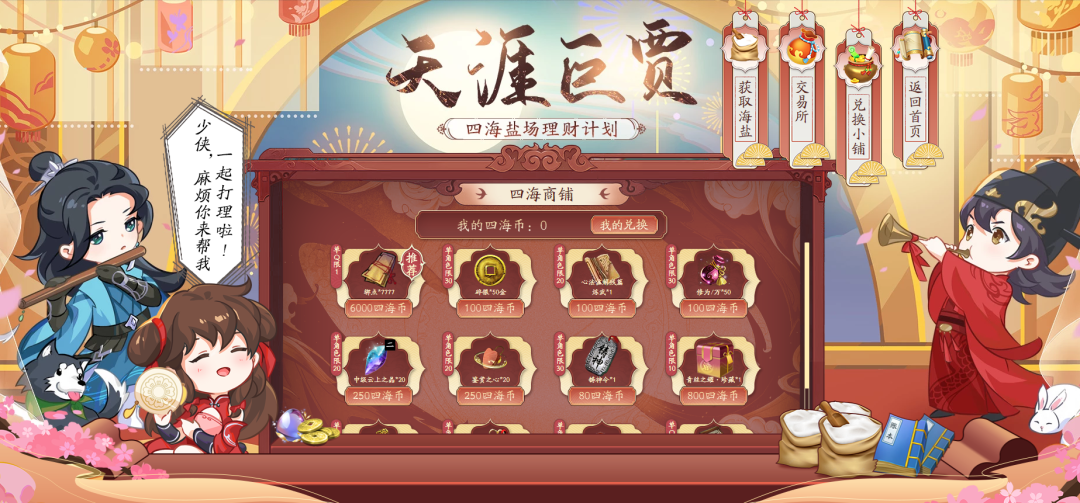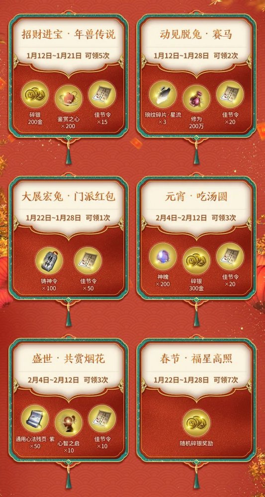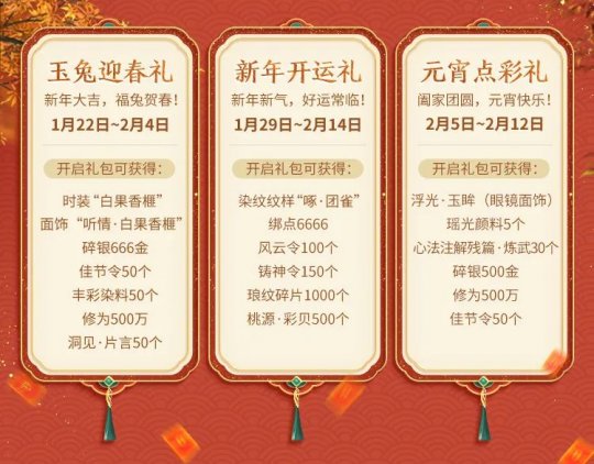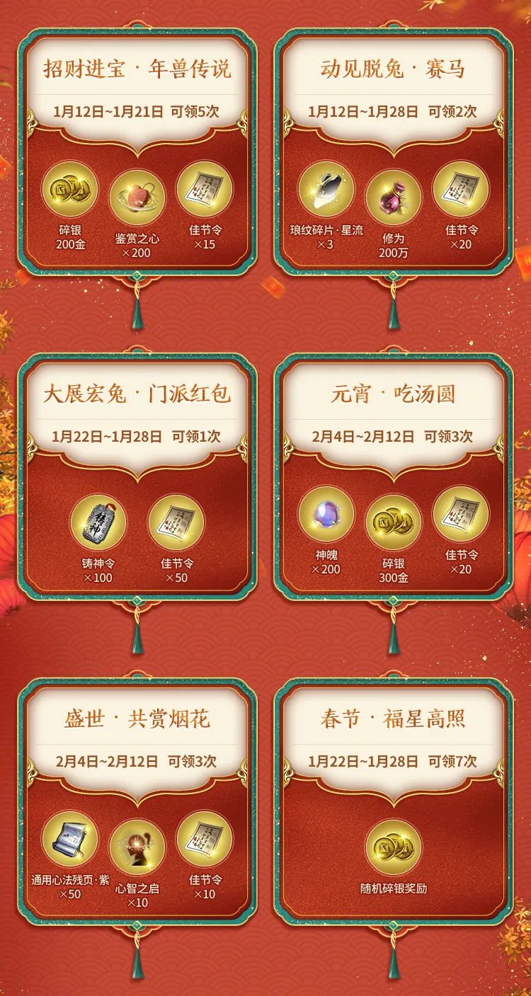 江湖有好景,天涯又一年。海量福利全民赠,登录即享四重好礼,更有外装【白果香榧】全民普赠! 添好运,萃文华。财与福,到万家。财气满满的新春华裳【心王·小财神】即将上架,饰品特效上新。 天涯财神到,天刀新春歌会与你相约星河巨幕,共度一场跨次元、甚至跨时空的浪漫盛会! 新春任务福利多多,天涯巨贾、助手APP福利活动同步上线。瑞兔送福,双倍天赏、限时折扣新春大促开启,祈年活动返利多多,累计充值最高可享天赏坐骑尾饰等限定豪礼! 四重登录礼包 登录礼包 新春迎新喜,登录领好礼! 1月22日至2月14日,玉兔迎春礼、新年开运礼、元宵点彩礼等多重好礼登录即领。 内含染纹纹样【啄·团雀】、眼镜面饰【浮光·玉眸】、丰彩染料、绑点、风云令、琅玟碎片、奇珍令等超多甄选好礼!还有全民普赠外观【白果香榧】等待少侠领取~ *活动时间及奖励道具以游戏实际上线为准 2023暖阳迎春在线礼 1月14日20点30分至21点30分,2023暖阳迎春在线礼守候少侠的到来。 开启即可获得道具好礼,更有机会获得随心染匣、高级·铸神令、金色混沌1级琅纹自选、冶玲珑·焰 (可竟价拍卖)、金句材料自选拍卖礼盒 (可竞价拍卖)?等稀有奖励! *活动时间及奖励道具以游戏实际上线为准 新春华裳 白果香榧 新年大吉,福兔贺春! 1月22日-2月4日,登录游戏开启【玉兔迎春礼】,即可获得永久新春时装“白果香榧”、面饰“听情·白果香榧”。 心王·小财神 添好运,萃文华。财与福,到万家。 所谓藏常于民、顺应民心之福报,因果相循,皆大欢喜。此真财神也。 富有年味、财气满满的全新时装【心王·小财神】将在春节期间上架商城! *实际效果以游戏内上线为准 同时,多种年味饰品特效也将同步上新! 天刀新春歌会 1月17日晚八点半,相约星河巨幕,共度一场跨次元、甚至跨时空的浪漫盛会! 当晚还会有兔年神秘“爆料”贺卡,敬请期待! 今年的新春歌会特别邀请到超越AI、邓丽君AI、喜羊羊与灰太狼为大家带来丰富精彩的演出。 当温柔甜美的嗓音跨过时空唱响,当童年的回忆重新涌起,就让这别样的新春歌会为我们揭开新的一年。 听新歌,领福利,看爆料,共欢聚。 除主会场外,少侠还可前往直播分会场酷狗直播、腾讯视频号进行观看。此外,前往杭州城观影还可领取刀刀为少侠们准备的新春观影奖励~ 新春任务&福利活动 新春任务 精彩节日活动将在春节期间同步上线,轻松赢取碎银、修为、铸神令、鉴赏之心、琅玟碎片、心智之启等多种奖励,一起感受冬日的快乐~ *活动时间及奖励道具以游戏实际上线为准 天涯巨贾 四海商盟朱小月特委托各位少侠代经营四海商会的海盐生意,少侠可通过“进货清单”中,完成每日任务获取海盐。通过出售海盐获取四海币,兑换海量绑点和成长道具。 每位少侠的海盐交易价格不一,少侠需发挥聪明才智,运筹帷幄决定交易情况哦~ *实际内容以游戏内上线为准 助手APP福利活动 助手新年活动将在春节期间开启,每日在活动页面累计签到即可获得高级·铸神令、天地金色琅纹任选等成长道具;此外,还将获得放烟花的机会,每放一次烟花即有机会获得8888绑定点券、随心染匣等丰厚好礼! 除夕夜、元宵节更可直接领绑点红包,少侠春节不要忘记在助手看看哦~ 新春大促 双倍天赏 限时折扣 活动期间,购买指定新品即可享受双倍天赏福利!此外,还有海量历史商城外观,限时折扣低至四折!购买指定点券类限时折扣历史外观商品,将以实际支付点券数,享受双倍天赏积分,消费满奖同步开启! 瑞兔送福 新春祈年 充值10元即可开启新春祈年。参与祈年抽奖即有机会瓜分海量陨焰之石、绑定点券! 全服祈年数达指定数额,即送全部参与祈年玩家海量绑点+福兔币+高级·铸神令+珍贵称号!累计充值享高比例充值绑点返利,累计祈年达指定次数更有天赏坐骑尾饰豪礼相赠! 一岁一礼,一寸欢喜。 笙歌间错华筵启。喜新春新岁。刀刀在星河巨幕之下,守候着少侠的到来。 愿与少侠岁岁年年,共欢同乐,嘉庆于时新。 |