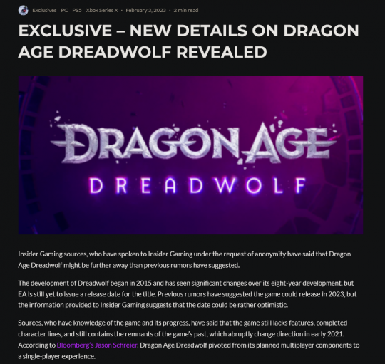 《龙腾世纪4:恐狼》或无法在2023年内推出