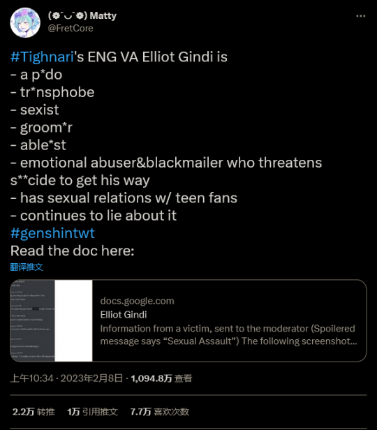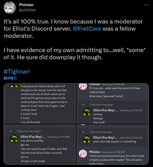 日前根据外媒报道,《原神》英配 Elliot Gindi,在游戏中为角色提纳里配音的演员,在 Discord 聊天记录被曝光后目前已经承认自己涉及粉丝的不当言行并为其道歉,但在道歉中他否认了玩家社区指控其有意骚扰未成年粉丝一事。 聊天记录此前于本周早些时候以谷歌文档的形式曝光,用户 FretCore 在推特上分享了这件事。FretCore 是 Gindi 个人 Discord 聊天频道的前管理员,他指控 Gindi 是一个“与青少年粉丝发生关系”的“groomer(俚语中指和未成年人建立感情关系的人)”,他曾进行“情感勒索”并以自杀威胁逼迫他人给他顺应他的意愿。该文档包含许多截图,其中涉及 Gindi 和他的 Discord 频道中的用户之间的露骨信息,以及与 Discord 频道管理员的互动。 该文件获得了另一位前管理员 phiotan 的证实,他公开了两人之间的聊天记录,其中 Gindi 表示他“与频道中的三个女孩有私下关系”。他还表示其中一个人有“双相情感障碍之类的”,并声称她自称只有 17 岁,尽管之后她道歉并表示自己“原本就是18岁”。 在曝光发生一段时间之后,Gindi 通过长推特发表了一份声明。在声明中他表示自己从未打算造成任何伤害,并且“认为一切都是双方同意且安全的”。但同时他也承认谷歌文档中的所有内容皆为事实。 Gindi 写道:“真实的内容包括:聊天记录和所有屏幕截图。是的,所有令人反胃的聊天。是的,如果它传出去,我确实威胁会自杀。我没有考虑到它的严重性。对此我很抱歉。” 然而他否认自己“有意”与任何未成年粉丝发生关系,也否认他在“等待某个 15 岁的人长到 18 岁”。他还表示,除了他在与 phiotan聊天中承认的三人外,他没有与任何人发生不当关系。 他写道:“我明白我的所作所为是错误和不恰当的,并尽我所能向我联系的人坦白。我对我觉得需要的情况作出了不恰当的回应,并在此过程中对很多人造成了伤害。我明白我的行为会产生后果,并且我承诺在努力改进并改善,同时承担全部的责任。” Gindi 的道歉在其他英文配音演员那里并没有获得太多认同。角色胡桃的英配 Brianne Knickerbocker 在推特上表示自己“很生气”,并认为“他的行为需要承担后果”。香菱的英配 Jackie Lastra 表示自己对“曝光的一切感到震惊”。角色琴的英配 Stephanie Southerland 表示自己“往轻了说感到恶心和不安”。其他人大多也都是类似看法。 一直通过自己的 YouTube 频道对角色的英文配音演员进行采访,并发布许多配音演员互动视频的《原神》男性主角的英文配音 Zach Aguilar 在推特上表示自己感到“失望和愤怒”,并表示“已经删除了和 Elliot 有关的直播。我拒绝以任何方式给这样一位人一个平台。以这种方式对粉丝使用你的权力是令人厌恶和可耻的。我为受害者遭遇这种情况感到难过。” 魈的英文配音演员 Laila Berzins 发布推文说道:“我的心与受到 Elliot 这件事影响的受害者同在。像这样利用粉丝或任何人是残暴和令人作呕的。我向所有受影响的人送去爱和支持。” 其他英配的观点也都一样。 毫不奇怪,许多玩家和粉丝要求将 Gindi 的配音从游戏中移除,而且目前根据米哈游的回应,他很可能会被移除。此前游戏中角色菲谢尔的乌鸦奥兹配音李元韬就因出轨被更替。 在给 GamesRadar 的一份声明中米哈游表示:“我们对我们的粉丝、游戏玩家、社区和任何受影响的人所遭受的伤害和损失深感遗憾。我们的内部团队包括我们的配音工作室在内的为外部合作伙伴一直在共同努力寻求紧急解决方案。我们会即时通知各位进展情况。” |