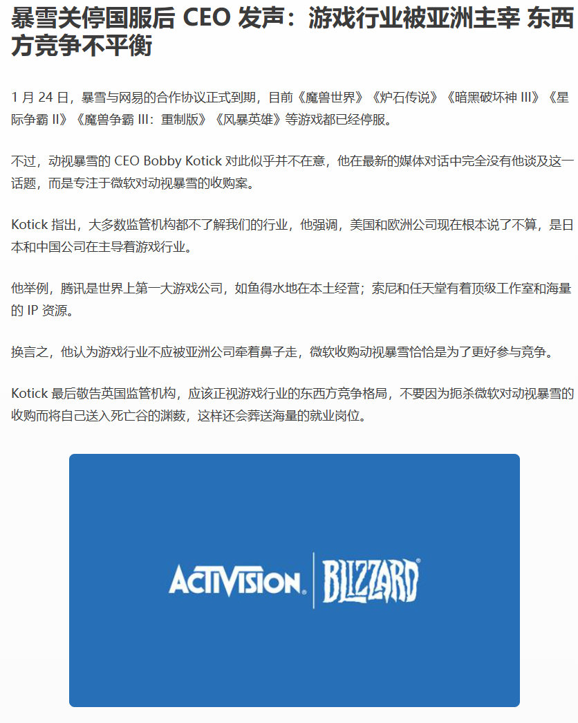 CMA建议拆分动视暴雪 动暴CEO表态:COD真没那么重要