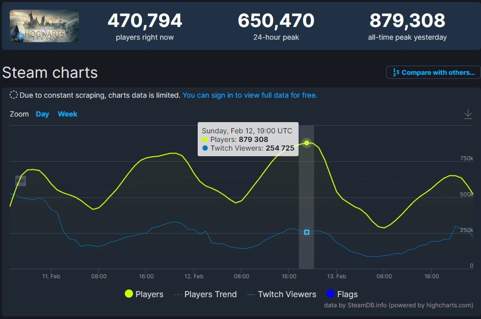 据Steamdb数据显示《霍格沃茨之遗》再次刷新纪录,Steam在线峰值超过87.9万人,在Steam所有游戏中排名第八。