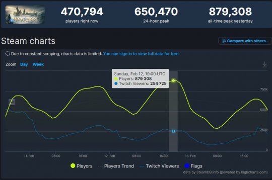 《霍格沃茨之遗》最高在线人数可能会定格在87.9万人,因为越来越多的玩家已打通关游戏,其热度开始下跌。