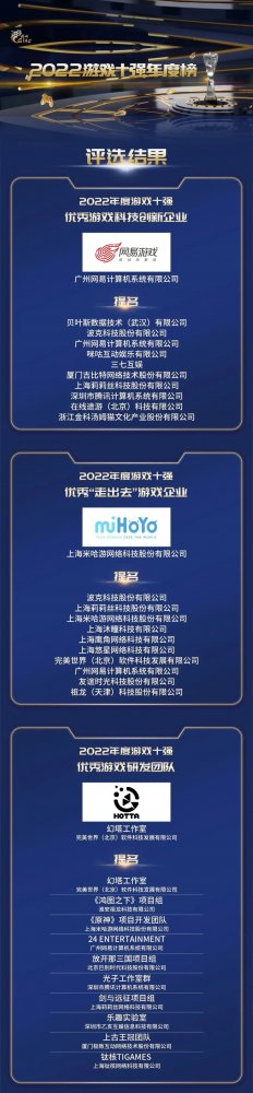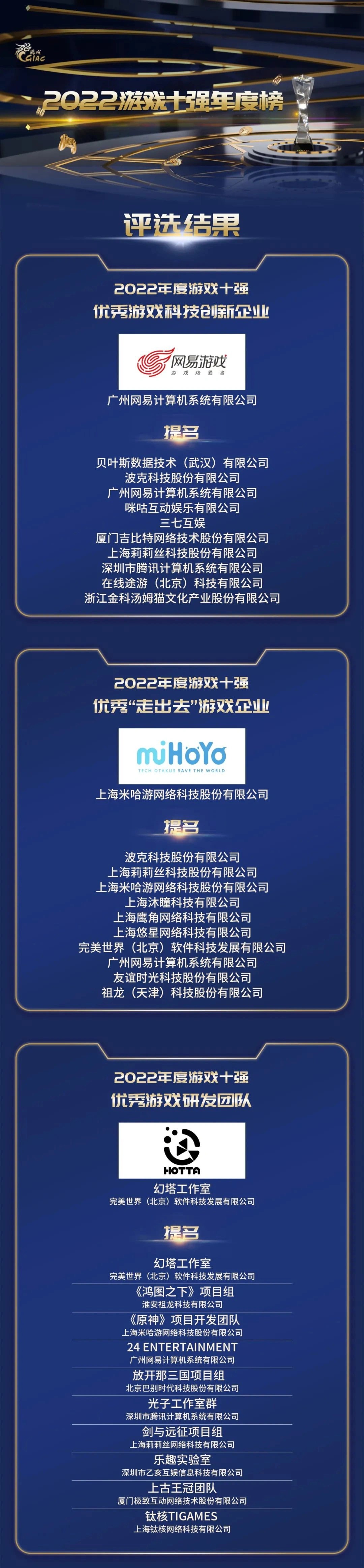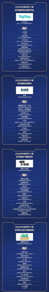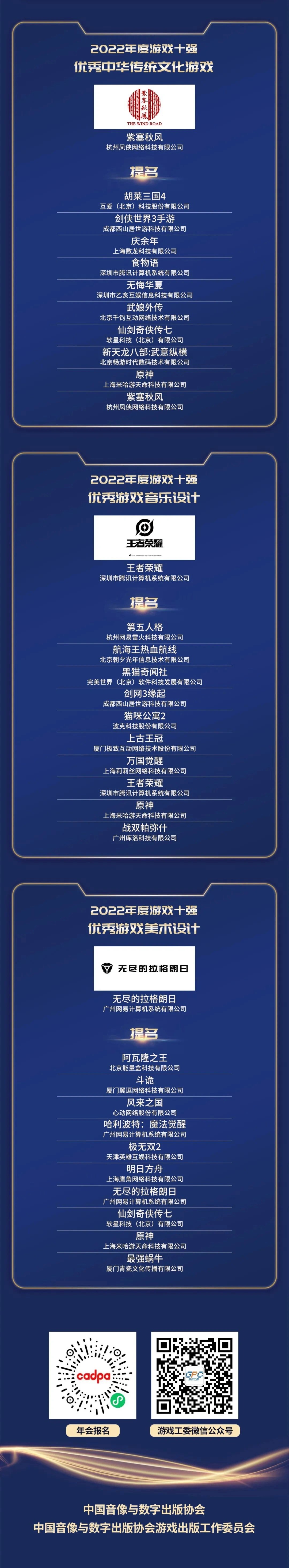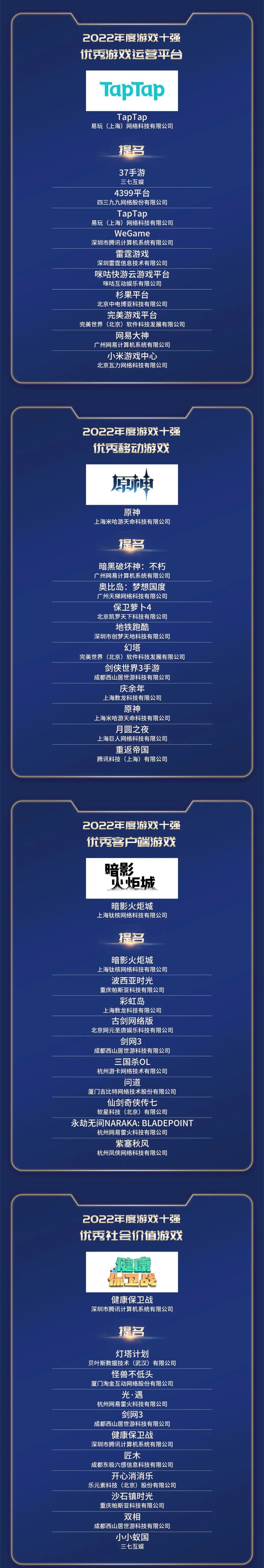 2022年度中国游戏产业年会于2月12日至14日举办,正式发布了 2022 游戏十强年度榜。 该榜单由十强优秀中华传统文化游戏、十强优秀社会价值游戏、十强优秀“走出去”游戏企业、十强优秀客户端游戏、十强优秀移动游戏等奖项组成,从10个提名中选出。 获奖名单: 优秀科技创新企业:广州网易计算机系统有限公司 优秀“走出去”游戏企业:上海米哈游网络科技股份有限公司 优秀游戏研发团队:幻塔工作室 优秀游戏运营平台:TapTap 优秀移动游戏:《原神》 优秀客户端游戏:《暗影火炬城》 优秀社会价值游戏:《健康保卫战》 优秀中华传统文化游戏:《紫塞秋风》 优秀游戏音乐设计:《王者荣耀》 优秀游戏美术设计:《无尽的拉格朗日》 |