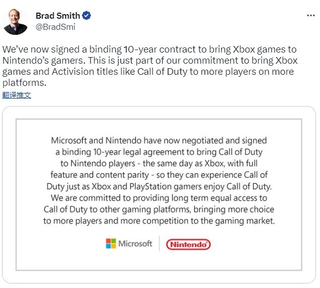 微软副主席Brad Smith今天(2月21日)在推特上发文宣布,微软已与任天堂签署了一份有效期长达10年的协议,这将把Xbox游戏和《使命召唤》带给任天堂游戏玩家,而《使命召唤》将与Xbox版同步,并且内容相同,今后任天堂玩家也可以享受与Xbox和PlayStation玩家一样的《使命召唤》游戏内容。此外,Brad Smith还表示这只是微软致力于将Xbox游戏和动视游戏(例如《使命召唤》)带到更多平台上的承诺的一部分。
