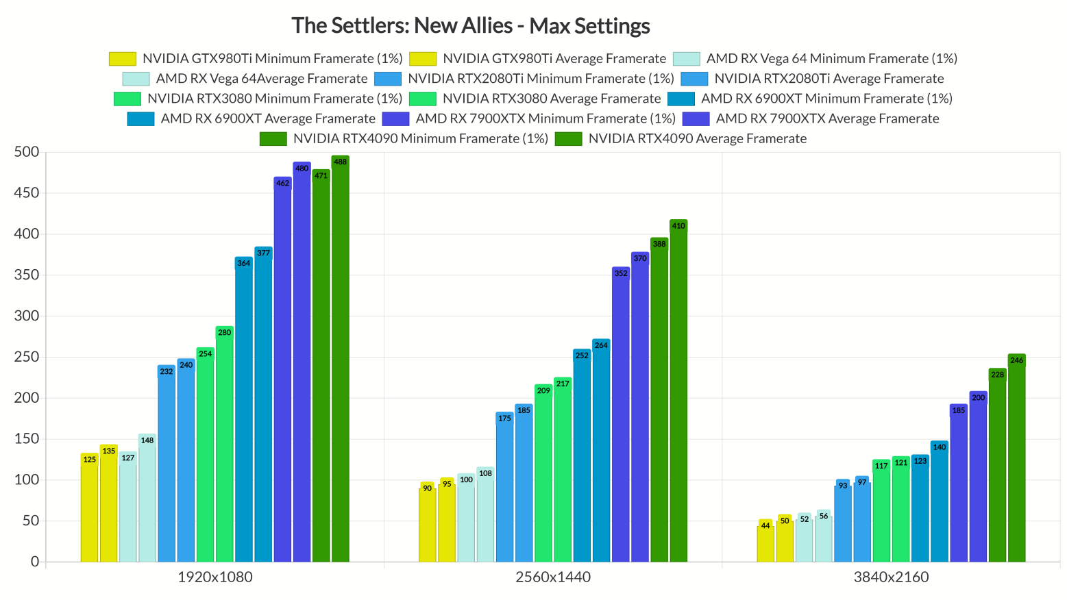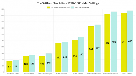 育碧旗下的策略游戏《工人物语:新兴同盟》已于2月17日登陆PC平台,油管主John Papadopoulos对其进行了性能测试,一起来看看它在PC 平台上的表现如何。 测试视频: 对于此次性能测试,测试人员使用了Intel i9 9900K、3800Mhz 的16GB DDR4、AMD的Radeon RX580、RX Vega 64、RX 6900XT、RX 7900XTX、NVIDIA的GTX980Ti、RTX 2080Ti、RTX 3080 和 RTX 4090。系统为?Windows 10 64 位,驱动为GeForce 528.49 和 Radeon Software Adrenalin 2020 版 23.2.1 驱动程序。 育碧添加了一些图形设置进行调整。PC 游戏玩家可以调整效果、环境、阴影、纹理、抗锯齿和水的质量。该游戏还支持 DX11 和 DX12。在本次测试中,测试者使用了最稳定的DX12 API。 在1080p/最高画质设置下,i9 9900K 将帧率推至 300fps以上毫无问题。因此,测试者没有模拟任何其他CPU 配置。在测试中,该游戏似乎受 GPU 限制,不需要高端 CPU 即可获得高帧率。 1080P下最高画质帧率测试: 在1080p/最高画质的设置下,参与测试的所有显卡都能够提供稳定的60fps 体验。即使是AMD Radeon RX580也能提供流畅的游戏体验。得益于DX12 API,AMD Radeon RX 7900XTX可以接近 NVIDIA RTX4090的性能。然而,与最近的一些其他 DX12 游戏相反,NVIDIA的GPU仍然更快,即使在相对较低的分辨率下也是如此。 在2K/最高画质的设置下,图中的显卡能够提供始终高于60fps的帧率。即使是 AMD Radeon RX Vega 64 和 NVIDIA GTX980Ti也可以毫无问题地运行这款策略游戏。至于在?4K/最高画质的设置下,RX 6900XT也能够提供流畅的游戏体验。 此外,该游戏不会出现任何卡顿问题。《工人物语:新兴同盟》非常流畅,即使在移动/平移相机时也是如此。测试者注意到了一些轻微的纹理流问题,但这些问题只是偶尔发生。此外,该游戏对VRAM 的要求非常低。 在图形方面,这款新的《工人物语》游戏看起来确实很棒。有很多高质量的纹理,还有一些很酷的可破坏建筑。测试人员这款游戏的性能和外观感到震惊。唯一的美中不足的是它的静态植被。开发者没有实现可弯曲的植被。测试人员表示《工人物语:新兴同盟》是最近PC上优化最好的游戏之一,虽然它没有突破PC 策略游戏的图形界限,但它看起来一点也不像一款廉价的手机游戏。 |