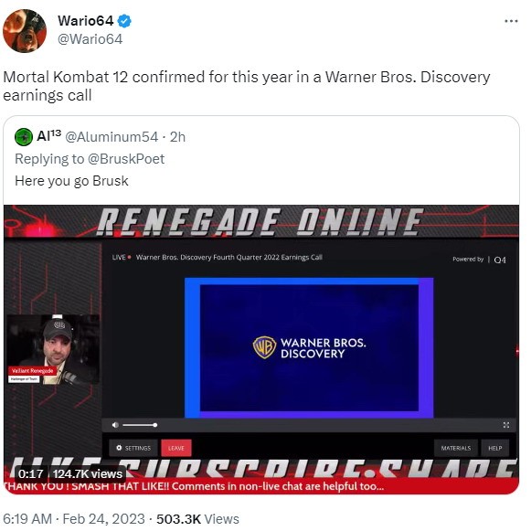 今日(2月24日)外媒IGN报道称,华纳兄弟探索全球投资战略执行副总裁Andrew Slabin在2022年第四季度财报电话会议上确认,《真人快打12》在开发中,将于今年内发布。