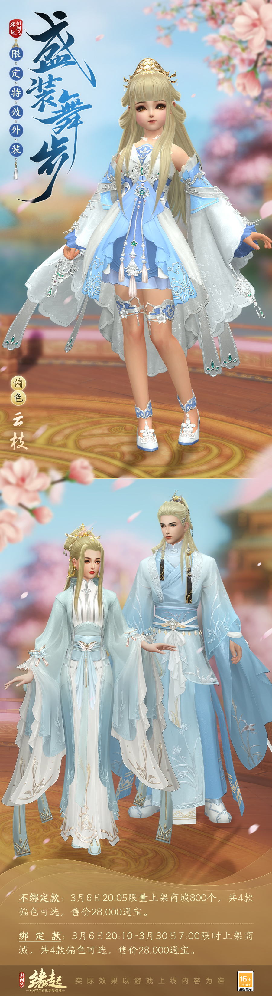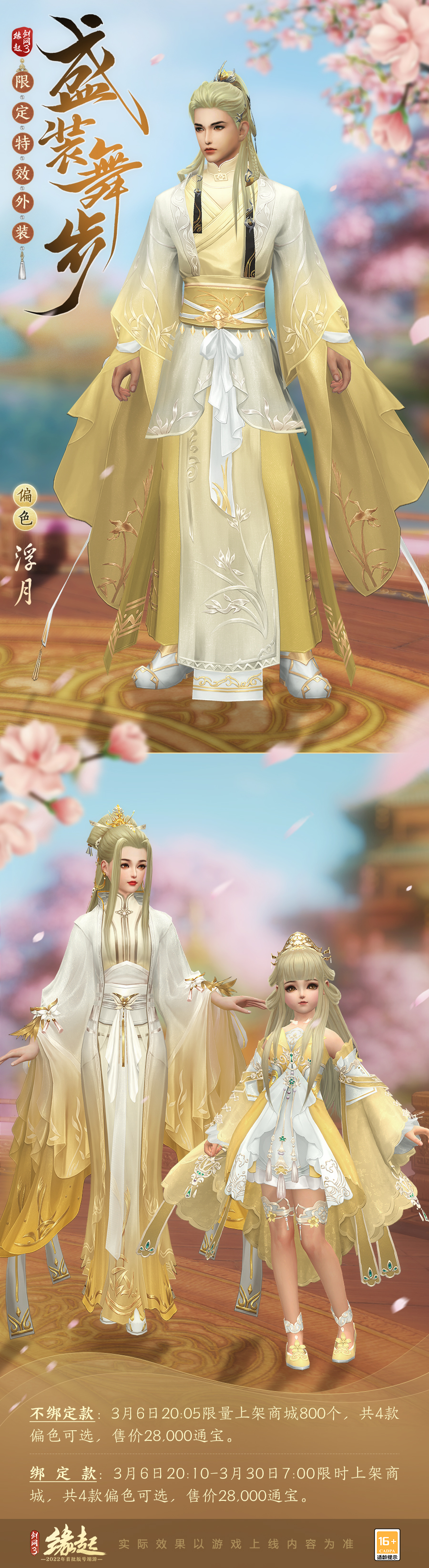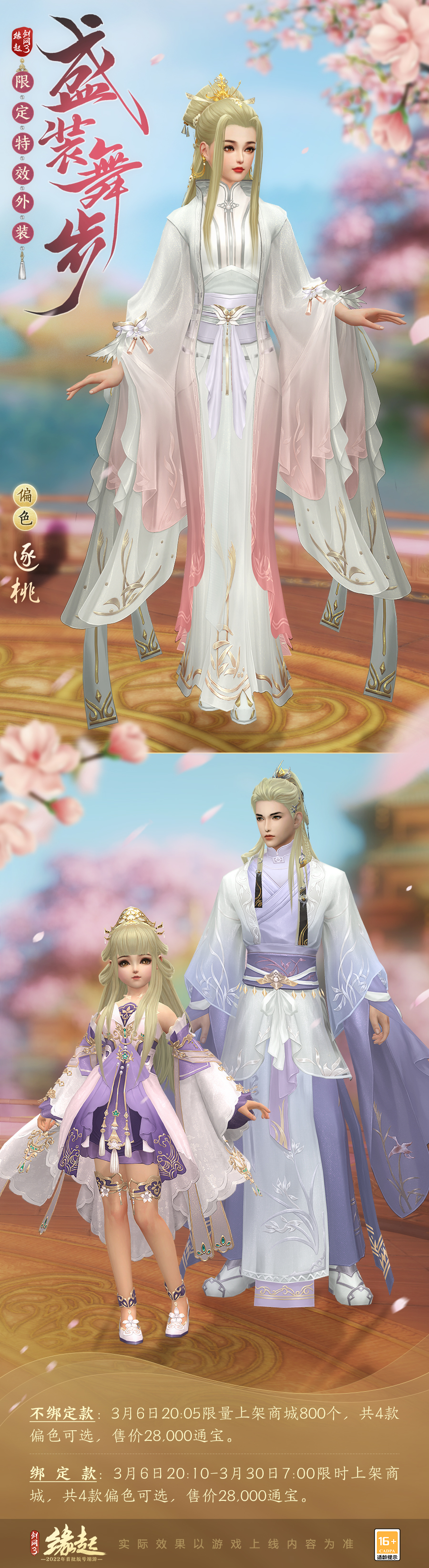 肃肃花絮晚,菲菲红素轻。微雨众卉新,一雷惊蛰始。春雷乍动、万物生机盎然。随着春季带来的暖意,《剑网3缘起》商城新衣上架!经典特效外装【盛装舞步】、月度限定外装【贺华岁】火热开售。更有全新冲销好礼水上双人奇趣坐骑【兰芷风烟】、【1.5倍积分】回馈各位侠士。锦罗玉衣,请君一览! 【特效外装“盛装舞步”惊艳亮相】 舞低杨柳步心月,盛装歌尽扇底风。 经典特效外装【盛装舞步】上架商城,共有四款偏色,售价28,000通宝。不绑定款将于3月6日20:05限量上架800份,绑定款将于3月6日20:10至3月30日7:00限时上架。 各体型成衣均有其独特特效动作表现,玉笛一支召鹤来,流光金帛舞步轻。 成女款长裙及踝腰线高束,温婉典雅,勾勒优美身形。衣缎层叠,色调渐变,长袖窄腰相映成趣。 成男款底衫素雅外罩薄纱,清俊文雅,精绣质感非凡。衣袖翩翩,风姿利落,广袖叠襟相得益彰。 萝莉款短裙翩飞衣料层叠,活泼明艳,尽显少女灵动。装饰夺目,裙摆蓬松,流苏珠宝相衬玲珑。 【月度外装“贺华岁”限时开售】 春风华岁相贺酒,绿杨深处晚风生。 月度限定外装【贺华岁】上架商城,共有两款偏色,为绑定款,售价20,000通宝,将于3月6日7:00至3月30日7:00限时上架。 成女款修身飒爽,金饰悬于上襟腰身,身形优美设计精妙。 成男款劲装逸群,长靴加身步踏流星,长摆尽显王者气概。 萝莉款少年英姿,衣摆满绣精致暗纹,短裙凌厉不失矜雅。 【亲友共赏春 冲销佳礼赠】 全新冲销好礼来袭!3月6日至3月30日,侠士累计冲销达指定档位,即可领取腰部挂件【坠星】、背部挂件【垂阳】、水上双人奇趣坐骑【兰芷风烟】。3月6日7:00至3月13日7:00,侠士在全区全服消耗通宝购买绑定商品、购买并实装不绑定商品立享150%积分回馈! 《剑网3缘起》多样绝伦外装今日纷呈上线!更有冲销好礼赠不停!欢迎各位侠士和亲友一起重游故地,回到梦开始的地方,追寻昔日江湖情! |