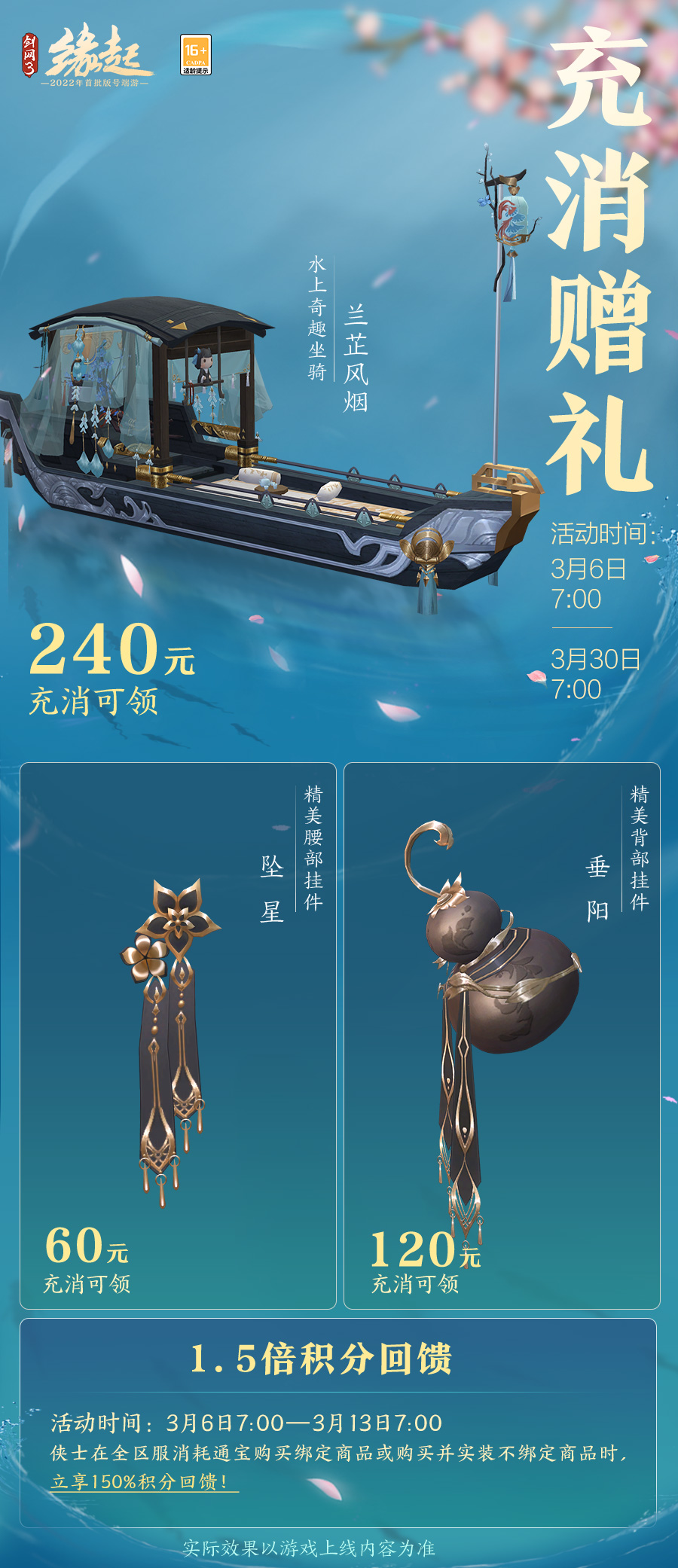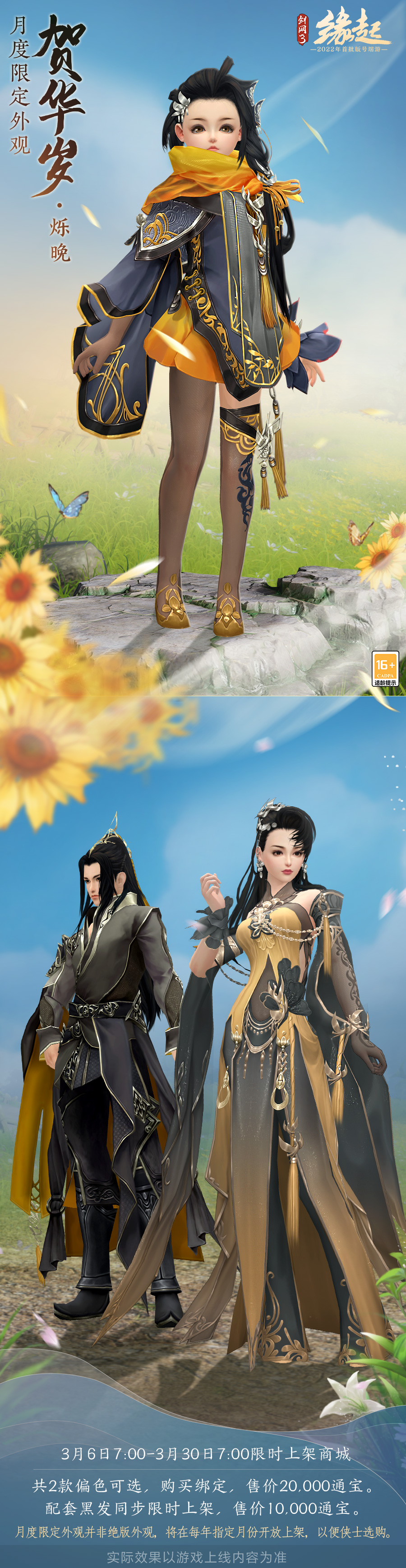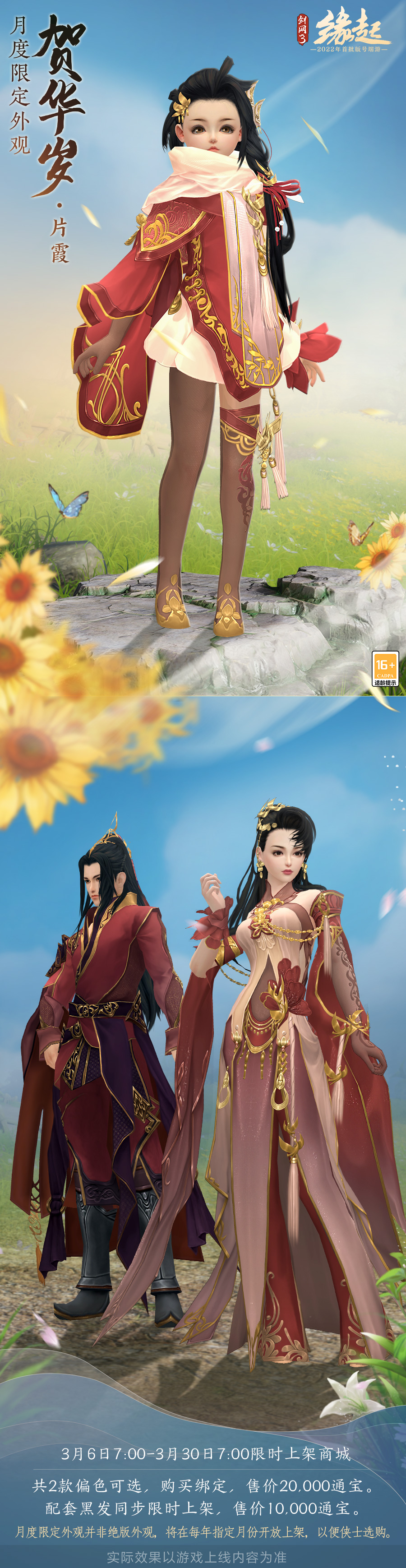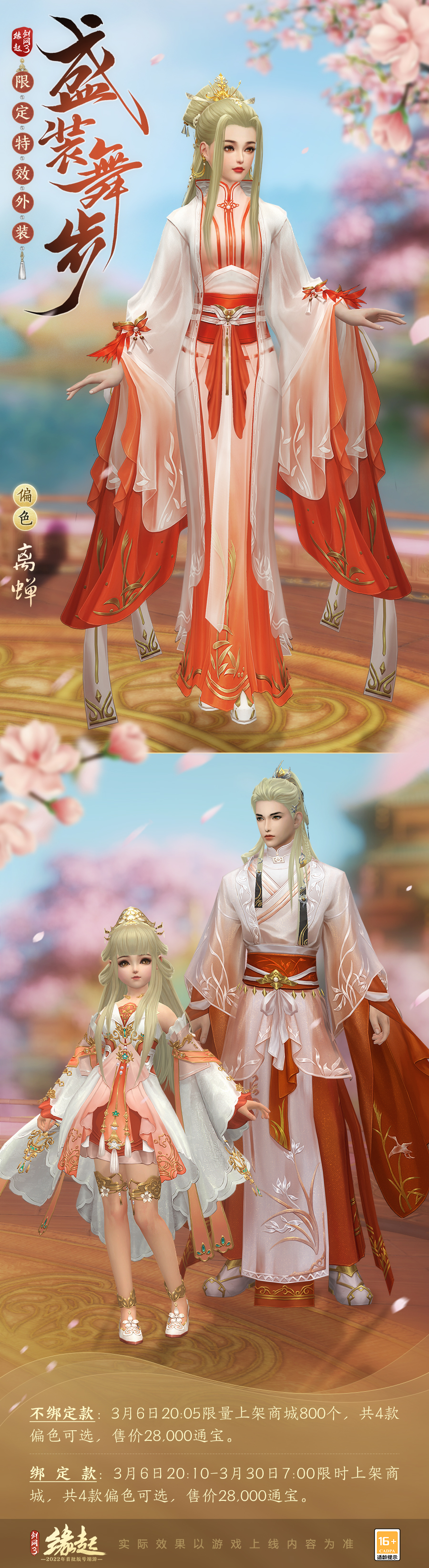 肃肃花絮晚,菲菲红素轻。微雨众卉新,一雷惊蛰始。春雷乍动、万物生机盎然。随着春季带来的暖意,《剑网3缘起》商城新衣上架!经典特效外装【盛装舞步】、月度限定外装【贺华岁】火热开售。更有全新冲销好礼水上双人奇趣坐骑【兰芷风烟】、【1.5倍积分】回馈各位侠士。锦罗玉衣,请君一览! 【特效外装“盛装舞步”惊艳亮相】 舞低杨柳步心月,盛装歌尽扇底风。 经典特效外装【盛装舞步】上架商城,共有四款偏色,售价28,000通宝。不绑定款将于3月6日20:05限量上架800份,绑定款将于3月6日20:10至3月30日7:00限时上架。 各体型成衣均有其独特特效动作表现,玉笛一支召鹤来,流光金帛舞步轻。 成女款长裙及踝腰线高束,温婉典雅,勾勒优美身形。衣缎层叠,色调渐变,长袖窄腰相映成趣。 成男款底衫素雅外罩薄纱,清俊文雅,精绣质感非凡。衣袖翩翩,风姿利落,广袖叠襟相得益彰。 萝莉款短裙翩飞衣料层叠,活泼明艳,尽显少女灵动。装饰夺目,裙摆蓬松,流苏珠宝相衬玲珑。 【月度外装“贺华岁”限时开售】 春风华岁相贺酒,绿杨深处晚风生。 月度限定外装【贺华岁】上架商城,共有两款偏色,为绑定款,售价20,000通宝,将于3月6日7:00至3月30日7:00限时上架。 成女款修身飒爽,金饰悬于上襟腰身,身形优美设计精妙。 成男款劲装逸群,长靴加身步踏流星,长摆尽显王者气概。 萝莉款少年英姿,衣摆满绣精致暗纹,短裙凌厉不失矜雅。 【亲友共赏春 冲销佳礼赠】 全新冲销好礼来袭!3月6日至3月30日,侠士累计冲销达指定档位,即可领取腰部挂件【坠星】、背部挂件【垂阳】、水上双人奇趣坐骑【兰芷风烟】。3月6日7:00至3月13日7:00,侠士在全区全服消耗通宝购买绑定商品、购买并实装不绑定商品立享150%积分回馈! 《剑网3缘起》多样绝伦外装今日纷呈上线!更有冲销好礼赠不停!欢迎各位侠士和亲友一起重游故地,回到梦开始的地方,追寻昔日江湖情! |