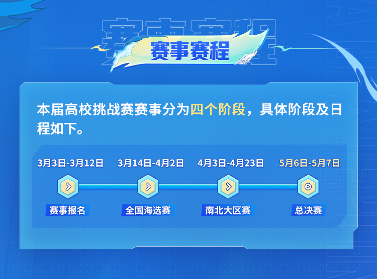 赛事介绍 青春如火,炽燃新生!《永劫无间》高校挑战赛,是《永劫无间》举办的面向全国高校玩家的大型赛事,赛事模式分为单排、三排两种模式,赛事阶段分为全国海选赛,南北大区赛,全国总决赛。来自各大高校的少年英雄将在此一较高下,表现优异者更能获得锦鲤杯的参赛资格!谁能拔得头筹,我们拭目以待! 赛事赛程 本届高校挑战赛赛事分为四个阶段,具体阶段及日程如下。 赛事报名(3月3日至3月12日)→全国海选赛(3月14日至4月2日)→南北大区赛(4月3日至4月23日)→总决赛(5月6日至5月7日) 报名时间及注意事项 玩家可以通过赛事专题页进行报名,报名时间为3月3日-3月12日,各位玩家在积极参与报名时,也需注意如下事项。 所有报名玩家,需通过永劫无间游戏中的学信网认证。 完成报名后,请务必按照指引进入报名选手通知群,赛事相关的事项均会在群内通知。 单排模式参赛选手不允许设置替补队员。 4、三排队伍中,要求每一位选手均来自同一高校;且每个队内最多有3名主力和1名替补的阵容。 5、玩家可以同时报名单排、三排赛事。 参赛奖励 积极参与比赛的选手,无论阶段,都能获得丰厚的虚拟道具奖励;成功晋级至南北大区赛和总决赛的选手,将依据名次获得丰厚的奖金;此外,晋级至总决赛的选手,在丰厚的排名奖金基础上,还能获得定制的实物奖励哦! 群英荟萃,高手云集!2023届高校挑战赛,让我们一起见证新的传奇! |