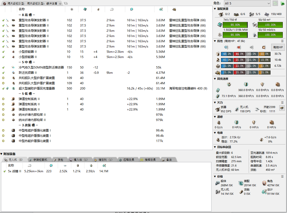 新伊甸探索之旅,开启! 征战星海的道路, 已经给大家铺好啦。 希望能帮助新船长们快速成长, 也欢迎各位老船长一同探讨交流~ 大家好,新的一周又和大家见面了,上次我们聊过了猛鲑级海军型,这次继续来看一下飓风级舰队型。 还是先从同衍生分支中进行横向比较,看一下舰队飓风这艘船的特性是什么。 从加成特点中可以明显看出,舰队飓风提供了较为新鲜的爆炸速度加成与信号半径降低加成,那么这两项数据不通过实际伤害模拟与承伤模拟是无法看出数值上优势尺度的,暂时先不详细展开。但我们应该知道,爆炸速度加成的作用在于有效打击高速低吨位目标,信号半径降低加成的作用在于面对使用大口径武器的敌人时,能够有效规避伤害。所以我们要明确,在使用舰队飓风时的前提是什么?第一是作为有火控加成的导弹船,有能力去有效打击高机动低信号目标,第二是在面对大吨位压制时更灵活抗压。 舰队飓风相对于原型飓风来说,从防御上复制了T2版本的指挥舰月刃级,并且基础护盾值上有了进一步加强,这种基础数值已经接近于战列吨位,所以当我们面对舰队飓风时,应当牢记一个非常非常重要的关键,那就是想把它击毁时要按照“战列吨位的防御”去考量。 总的来看,舰队飓风的两大特性显而易见,优秀火控的持续性输出(重攻导),附带免伤(低信号半径)加成的优秀强力防御。那么究竟有多优秀呢?还是以实际模拟来看效果。 我们以一条标准配置的狞獾作为标靶,信号半径202m,速度1900km/s,使用海军重攻导攻击时提升了接近200的DPS,不过当然舰队飓风多了一个导弹架子,但实际效果还是不错的。要问效果有多不错,一个狞獾的有效是5万,粗略估算时间的话,击毁时间差相差近半分钟。 并且在面对低吨位时,我们再进行模拟,可以看出击毁一艘标配剑齿虎时,已经相差近一分钟。 当然了,实际接战时,情况是错综复杂的,有时目标可能已经被挂网、甚至被挂短反关推,或者并不会在开推的情况下被一直输出。但希望大家明白,我们当前的模拟仅为关注舰队飓风的火控优势。(护卫吨位和加力目标并没有讨论和模拟,因为这两种目标重攻导的火控无论如何叠加加成,都不能有效打击,除非上网或者扰频) 以上我们仅分析了舰队飓风的火力和防御性能,还不足以将舰队飓风使用场景和方式进行定位,真正限制一条船可以承担何种角色的关键要素在于这条船的可利用闲置中槽数目。所以可惜的是,CCP并没有给予舰队飓风太多的发挥方式,5个中槽的尴尬使得舰队飓风“鱼与熊掌不可兼得”。 本期仅为大家介绍两类制式配置以供消遣。第一类是重导双推的广域火力覆盖风格,配置如下 重导+50MN微曲+100MN加力 较类似于重突改版前的重导小希,有区别的特点在于50MN微曲与100MN加力的转换,当舰队需要灵活位移时使用微曲,到达理想位置时再切换加力抗压。 第二类是重攻导的中近程高火力输出风格,配置如下 重攻导+50MN微曲+10MM加力 该配置亦较为简单,中近程集群抗压针对旗舰级吨位的良好选择之一,当然我们也可以选择更加简单粗暴,单10MN加力,注电和跳刀就可以直接舍弃替换为盾扩等进一步强化防御。 如果我们非要来点花样的话,其实我们能够发现,舰队飓风的CPU和PG相对于少的可怜的中槽来说,实在是太充裕了,所以我们也可以尝试在保证一定有效的前提下,追加跨级注盾或跨级加力来实现更多不同的作战需求,注盾配置如下 重攻+有效+超大注 飓风级舰队型总的来看是一个相对简单到质朴的船型,可能我们并不应该有太多的杂技想法,就以简单粗暴的方式来硬碰硬地直视对手,大概这是真正地体现,米玛塔尔人一直以来,为自由而战的最纯粹、最原始的信念。 |