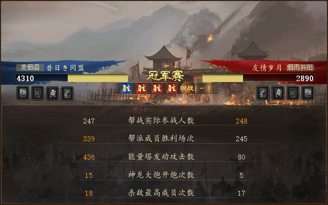 导语:“帮派群雄巅峰赛”圆满落幕,恭喜【凌烟阁】昔日き同盟获得冠军荣耀! 倾城一战三界至尊,傲视群雄睥睨纵横!众所瞩目的“帮派群雄巅峰赛”正式落下帷幕,恭喜【凌烟阁】昔日き同盟成功夺得本次赛事冠军之尊,恭喜【烟雨斜阳】友情岁月获得赛事亚军之位,恭喜【红颜知己】君为兄弟而战获得季军之位,恭喜【傲雪凌霜】ぃ邪派い六道获得殿军之位! 后来居上实力不凡 精彩对决巅峰一战 3月12日(周日)14:00,“帮派群雄巅峰赛”季军&冠军争夺赛相继开启,【凌烟阁】昔日き同盟、【烟雨斜阳】友情岁月、红颜知己】君为兄弟而战、【傲雪凌霜】ぃ邪派い六道四大帮派齐聚江湖巅峰之战,为所有大话兄弟,送上了精彩绝伦的终极之战! 【凌烟阁】昔日き同盟VS【烟雨斜阳】友情岁月 冠军赛对战之中,【凌烟阁】昔日き同盟虽只拿下一场挑战胜利,但是在帮派成员胜利次数上获得了绝对优势;能量塔攻击次数高达436次,是对手的五倍有余,以此稳稳压住对方输出;同时神龙大炮15次开炮,扣掉对方相当多体力,让对手几乎没有还手之力,在如此猛烈的攻势之下,想必对手应该是感受到了极大的压力,【凌烟阁】昔日き同盟就如此以稳健的打法操控全场节奏,获得了本场对战的胜利。 【傲雪凌霜】ぃ邪派い六道VS【红颜知己】君为兄弟而战 季军赛对决之中,【红颜知己】君为兄弟而战格外强势,拿下了全场挑战胜利,这样的战绩几乎已经可以奠定了本场赛事的最终结果。能量塔333次的攻击,也足以让对战方措手不及,31次神龙大炮次数开炮,几乎是将对战方的体力打压到了极致,无论是在挑战还是在能量塔和神龙大炮的操控上,【红颜知己】君为兄弟而战可以说是在实力和心理上都给对战方带来了相当压力,也是稳稳当当获得了本场对战胜利! 再次恭喜【凌烟阁】昔日き同盟成为“帮派群雄巅峰赛”的冠军,让我们看到了后来居上者不凡的实力和默契的配合,最强帮派,实至名归!恭喜【烟雨斜阳】友情岁月获得赛事亚军,恭喜【红颜知己】君为兄弟而战获得赛事季军,恭喜【傲雪凌霜】ぃ邪派い六道获得赛事殿军,感谢你们对于赛事的支持和付出,你们的热爱和实力,我们有目共睹! 至此,扬旗竞锋芒帮派活动圆满结束!感谢所有参赛帮派,为兄弟们送上一场又一场精彩刺激的帮派大战,让我们在激烈的战火之中,感受到了大家对于帮战玩法的喜爱,更感受到了大家对于守卫帮派荣耀的坚定! 相信大话江湖里,每一位兄弟,对于自己的帮派都有着特别深厚的感情,我们期待未来的故事里,我们能够看见大家撰写更多帮派传奇故事,更期待大家在以后的帮战之中,带来更精彩的表现! |